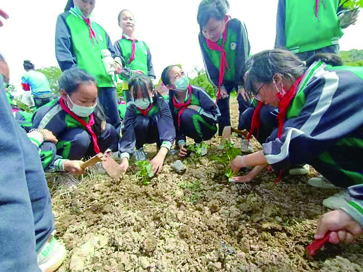 ▲学生在进行丝瓜种植活动。 通讯员/潘婷 摄
