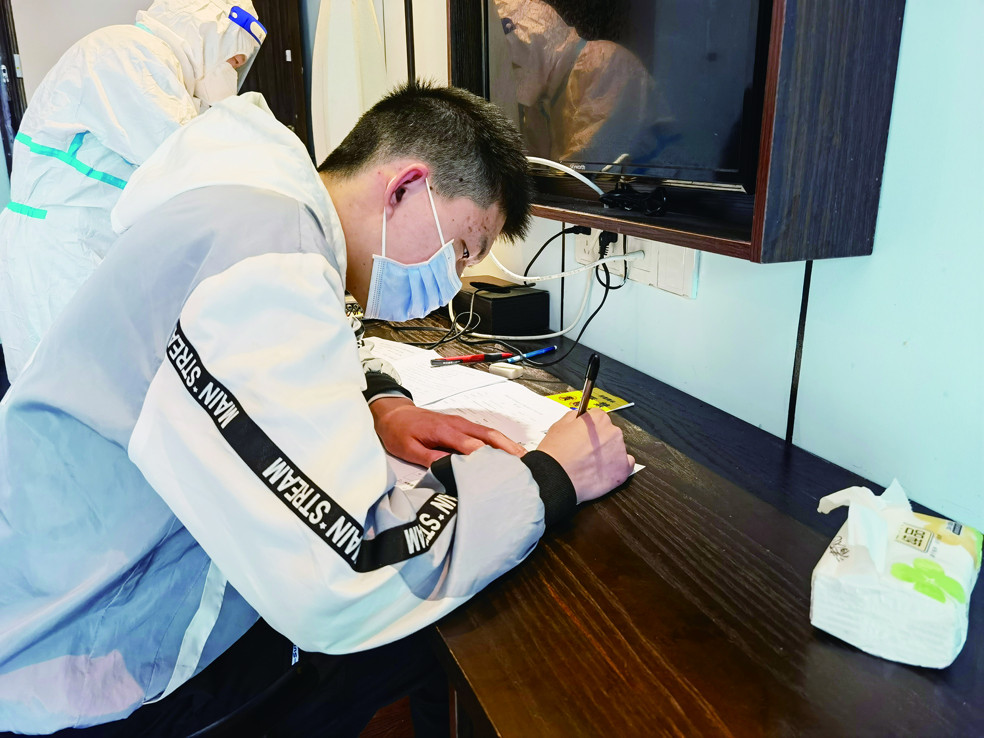 ▲袁鸿在隔离点特殊考场进行考试。 通讯员供图