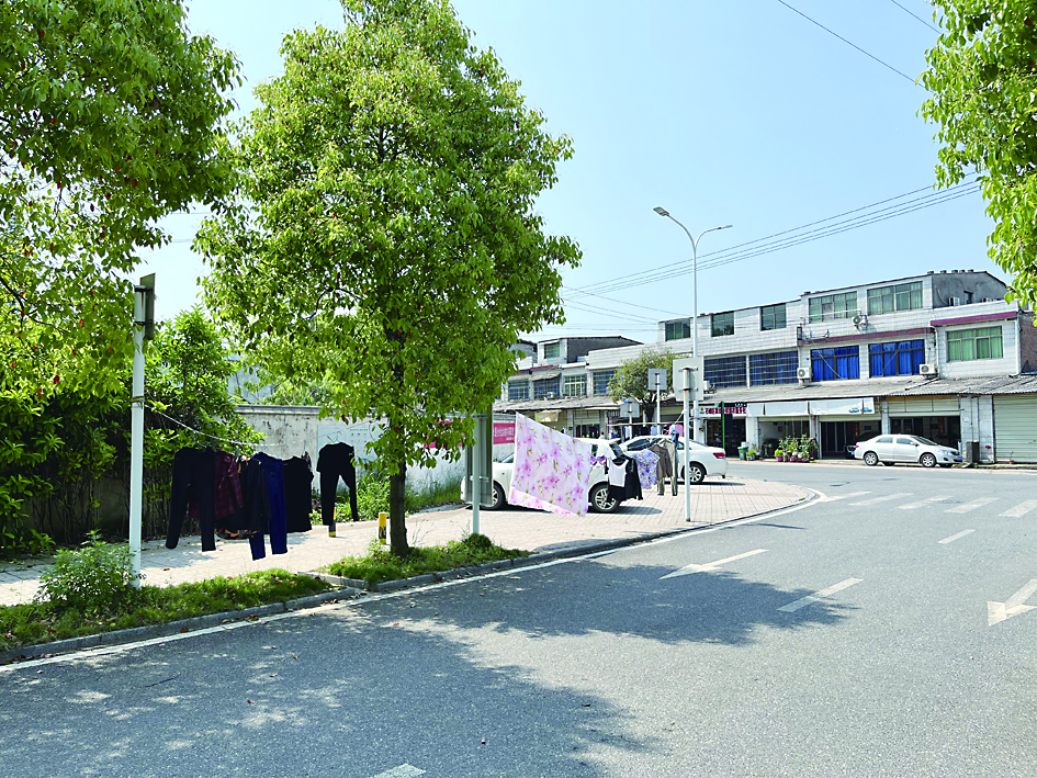 ▲白马村村委会周边,人行道上晾晒衣物。 记者/刘平 摄