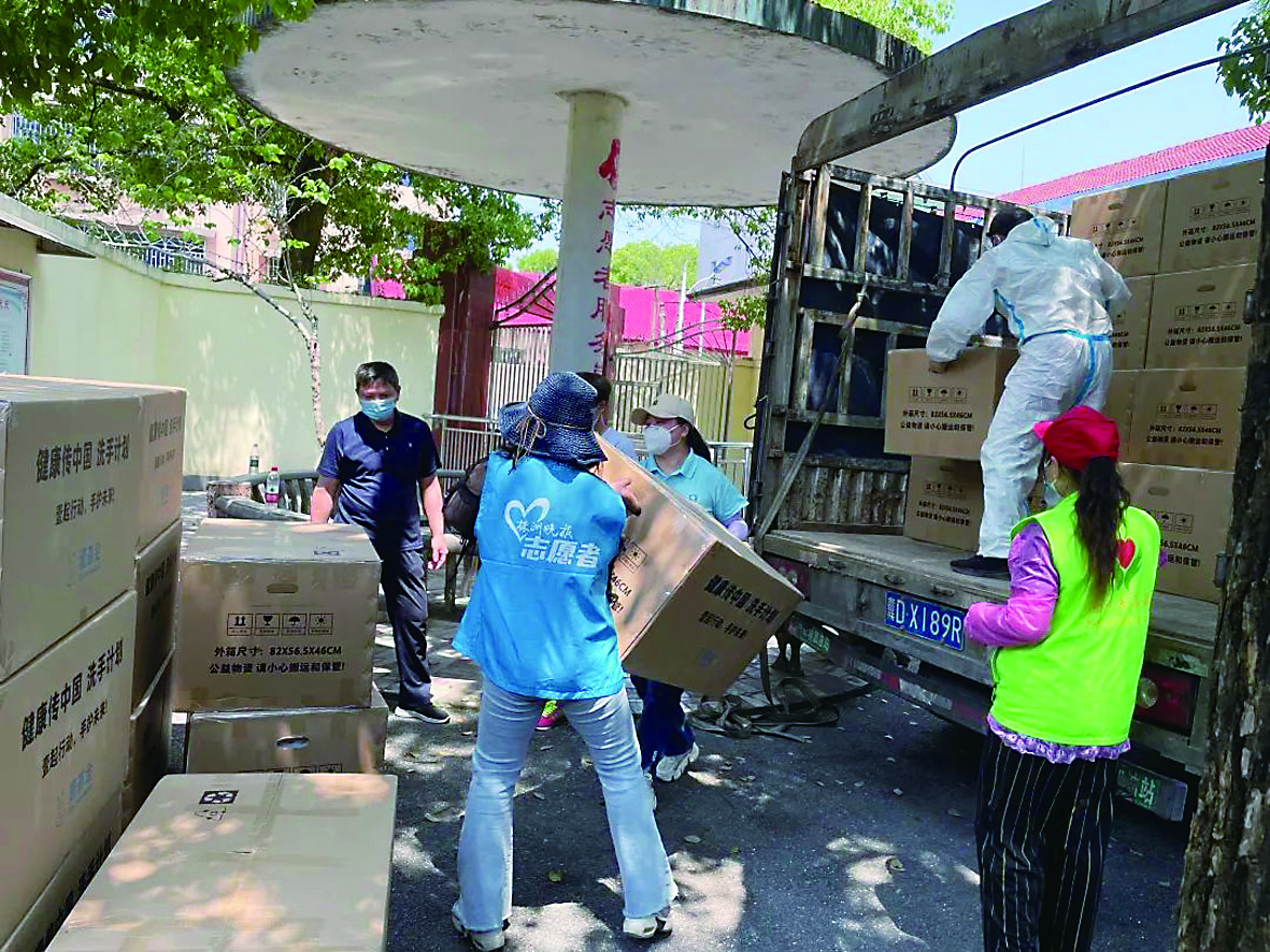 ◀志愿者搬运设备。 通讯员/彭程 摄