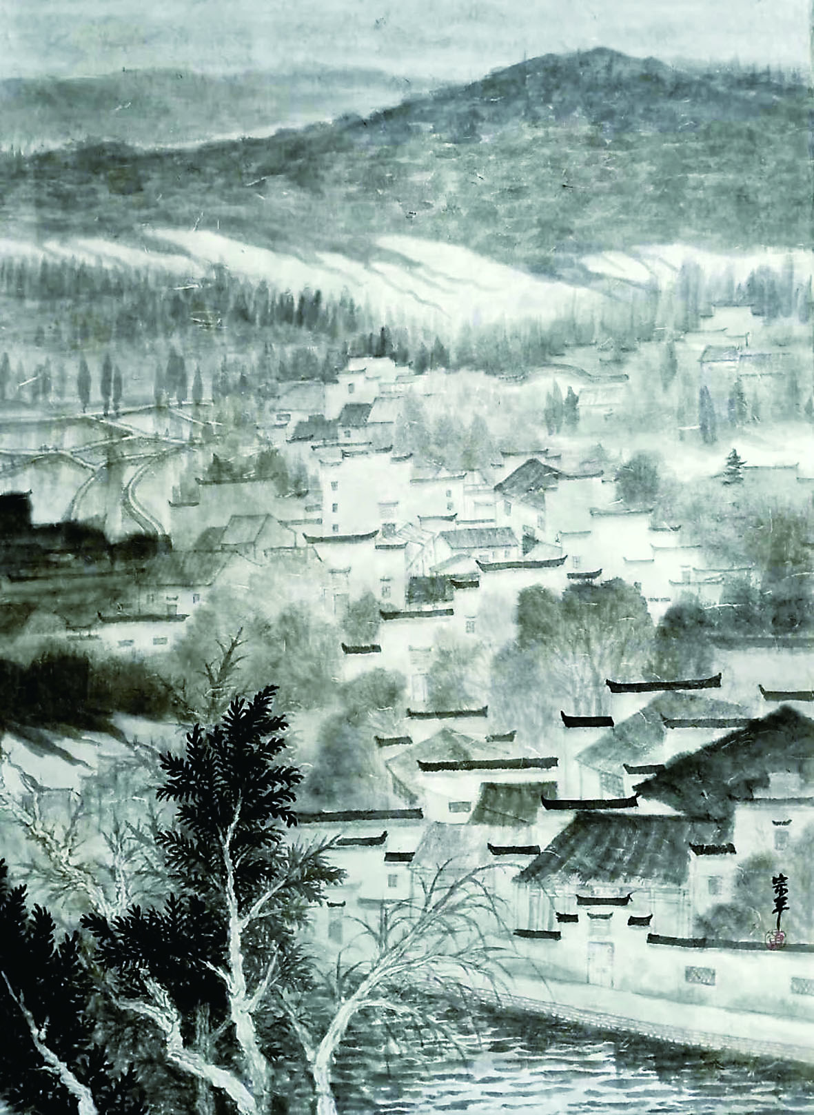 他的水墨浅降山水,也画得得心应手,如《湘山新气象》《侗乡新韵》《红色湖湘系列》,于山形水态中,见秀润、清丽和隽永的艺术品位,使人想起他是否在李可染的山水画中,吸取了足够的营养,继而镕锻出自己的画风,或许是师法多家先贤画谱,再从实地考察中,颖悟出自己的画境、画格。总之,我喜欢他的山水画,大气而不窘迫,粗犷而不粗率,有自己的想法和笔墨。