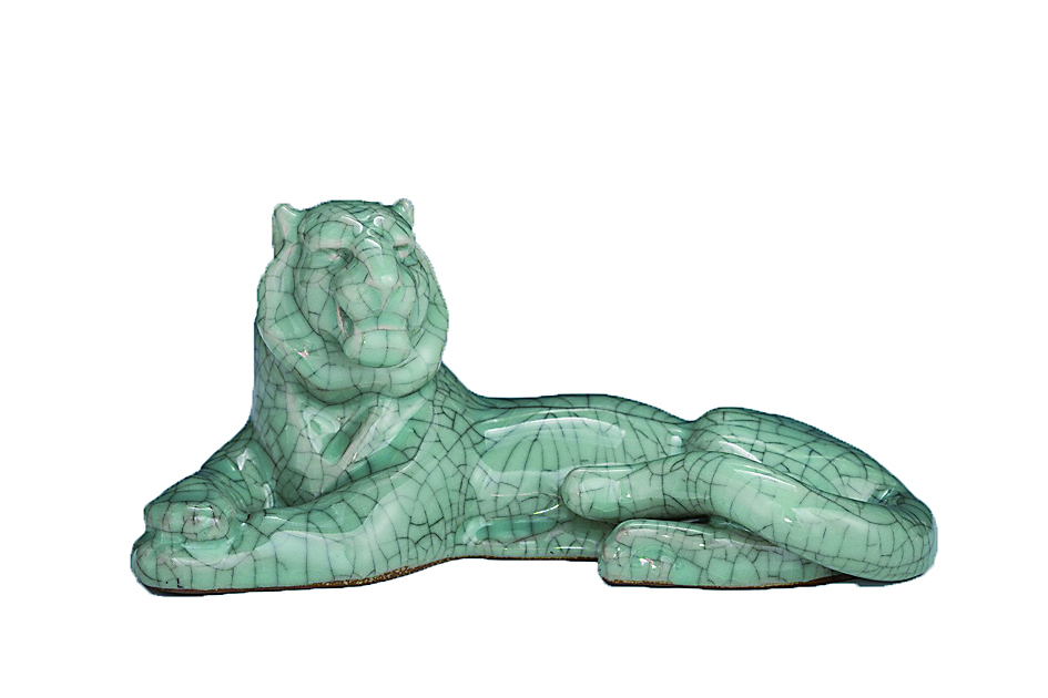 郭琳山大师从艺数十年,制作手法多样,他不仅熟知陶瓷工艺,更擅长陶瓷艺术雕塑。其作品涉及青瓷瓷塑、高温色轴装饰瓷塑等类别,并以材质与釉色的运用见长,具有鲜明的艺术风格。《南宋官窑釉瓷雕虎》继承了南宋官窑陶瓷以釉色取胜、以纹片著称、以造型见长之三大优点。作品描绘了一只老虎慵懒的趴着,通体粉青,在质感上追求璞玉的效果。造型严谨肃穆,昂首凝视,虎视眈眈,凸显虎虎生威,纹片有疏有密,有深有浅,形成纹片碎路,纵横交错,极不规则又在规则之中,恰似老虎皮毛的斑斓。经过人工染色,从而达到“金丝铁线”的艺术效果,显得风韵别致、古色古香。官窑瓷器以小型器为多见,体积不大。但是它所表现的气度,却不可漠视。