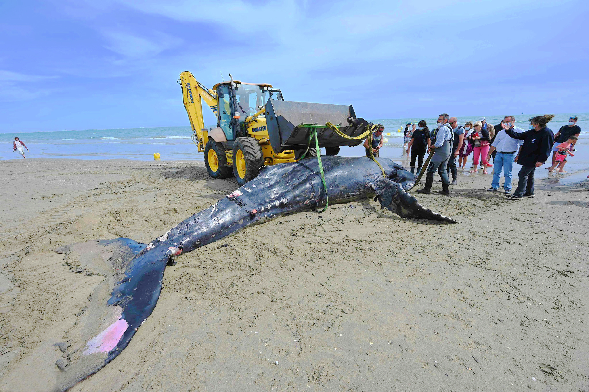▲当地时间2021年5月26日,法国南部拉格兰德莫特,一头七米长的鲸鱼搁浅在附近的卡纳海滩随后死亡,工作人员用挖掘机将其运走。