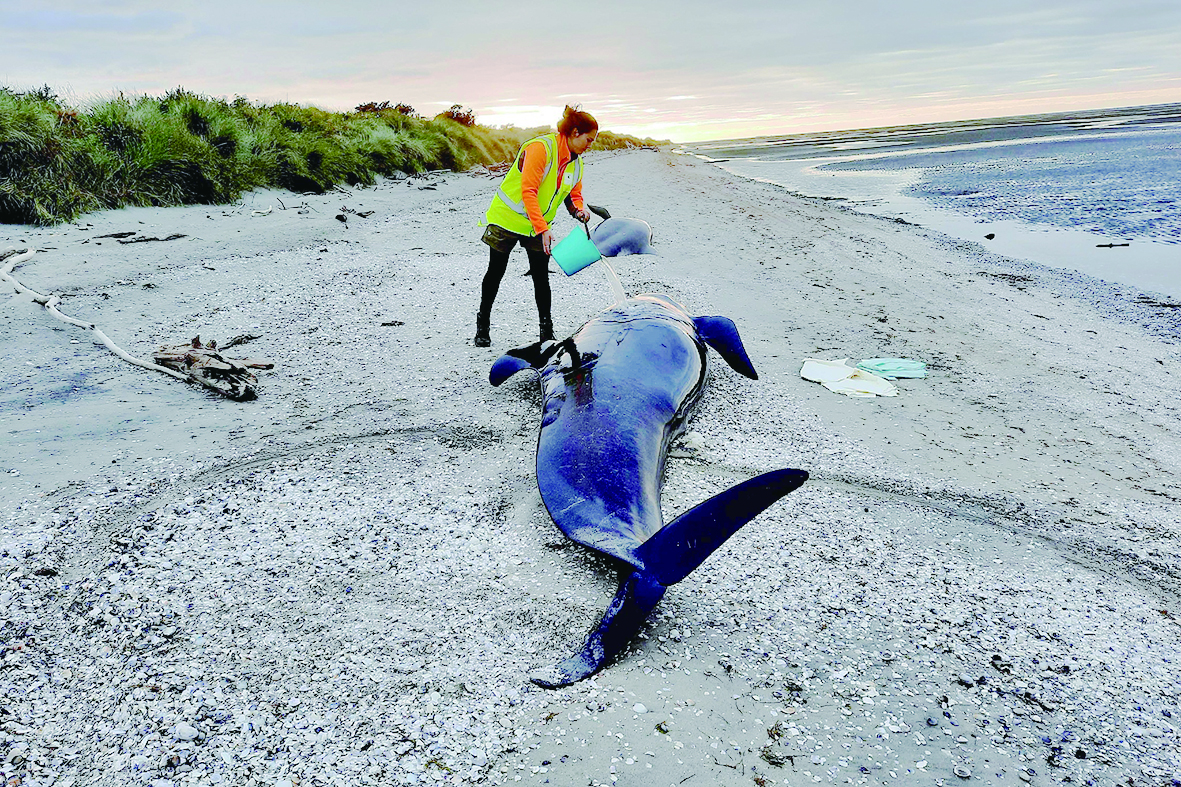 ▲当地时间2022年3月18日,新西兰南岛,野生动物保护员为一条搁浅的鲸鱼补水。3月18日,野生动物负责人称,20多头鲸鱼在新西兰一处海滩搁浅死亡。