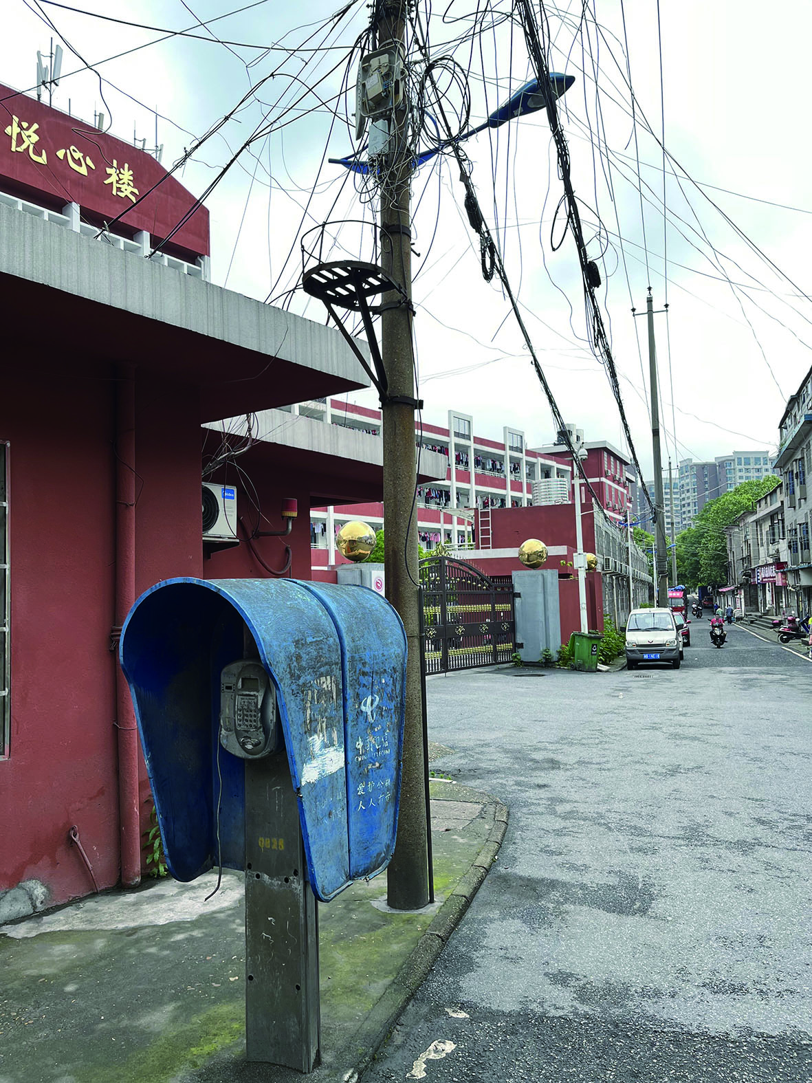 校门口路段,空中电缆线杂乱;人行道上的电话亭,油漆脱落,处于废弃状态。