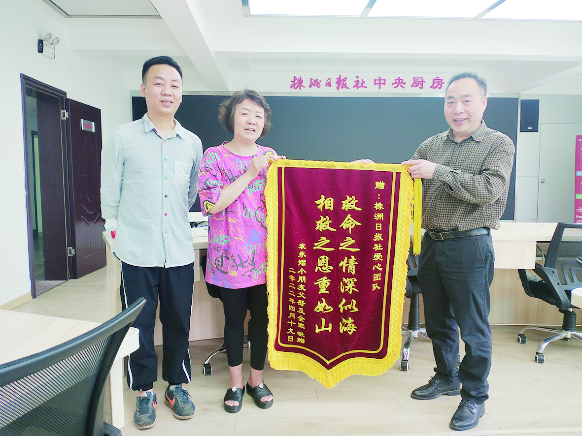 ▲株洲日报社编委陈汉秋(右)从熠熠家属手中接过锦旗。记者/廖智勇 摄