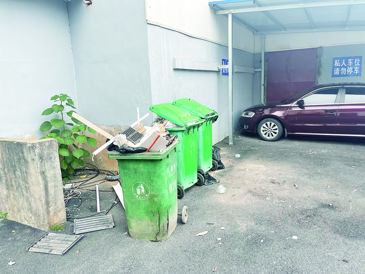 然而,记者在棉纺厂路附近看到了不一样的状况。一处刚刚建设的垃圾分类收集亭前摆着两个布满污痕的垃圾桶,其中一个垃圾桶已经破损开裂,隐约可以看到里面的垃圾。
