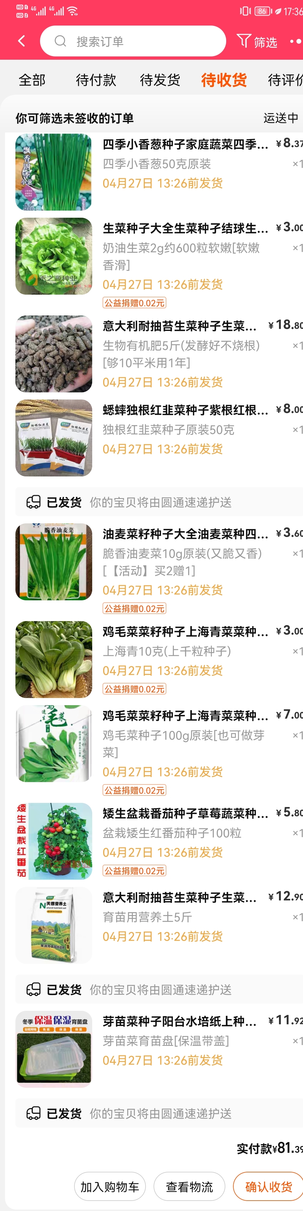 尽管菜种子还在快递途中,她好像也能提前体验到种菜的快乐。打开她的淘宝订单,包含四季小香葱、生菜、韭菜、油麦菜、鸡毛菜、番茄等10多个蔬菜品种,还配备了营养土、育苗盆等。