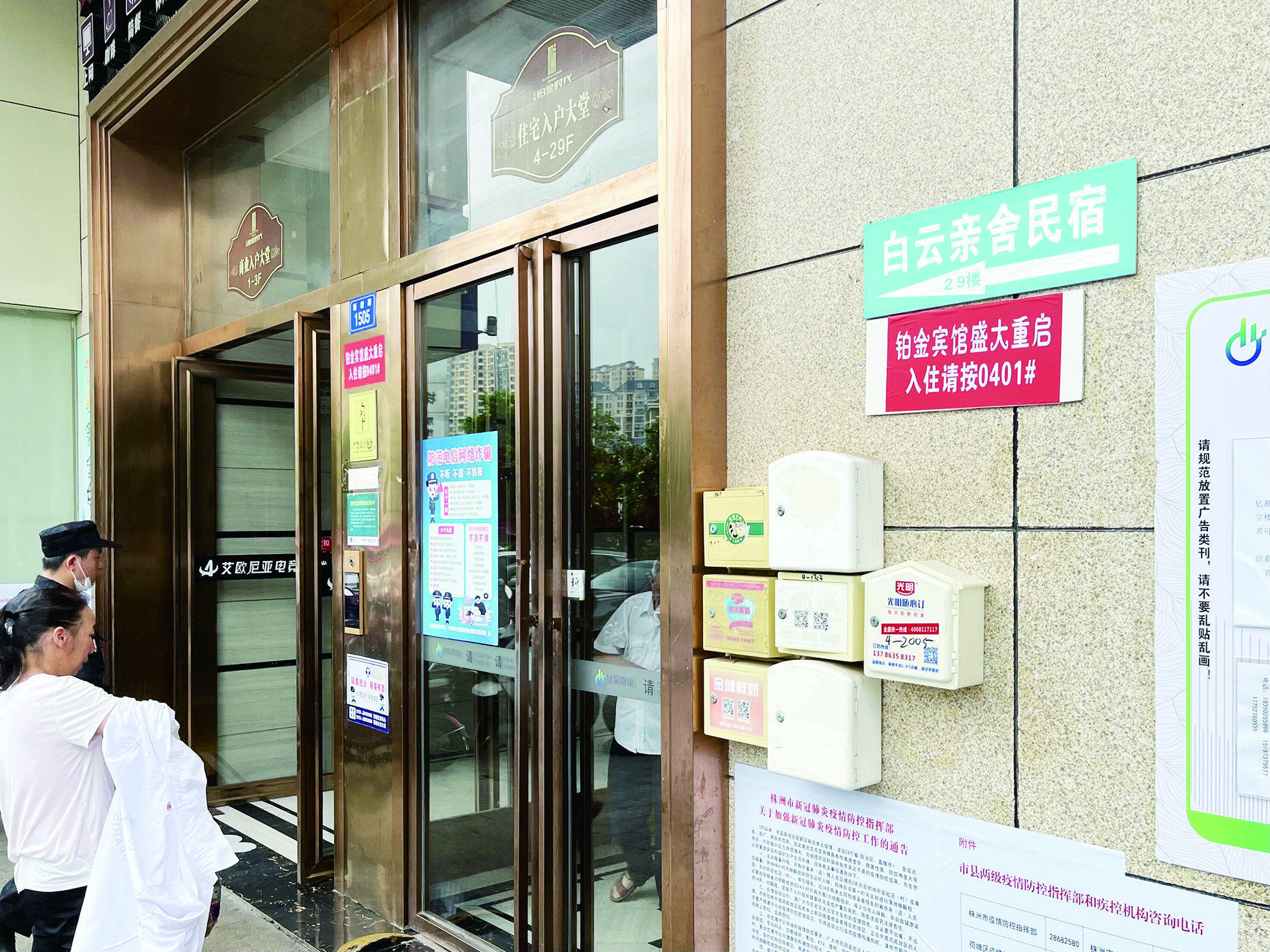 ▲住宅入户大堂门口,张贴着两家宾馆的指示牌。记者/刘平 摄