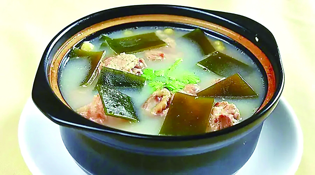 做法:先将海带清洗浸泡,放笼屉内蒸半小时,取出再用清水浸泡4小时,洗净控水,切成长方块备用;排骨洗净切段,入沸水锅中煮一下,捞出洗净备用;然后在锅内加入1000毫升清水,放入排骨、葱段、姜片、黄酒,大火煮沸,撇去浮沫,再用中火焖煮约20分钟,倒入海带,再用大火煮10分钟,将姜片、葱段捞出,加味精、盐调味,淋入香油即可。