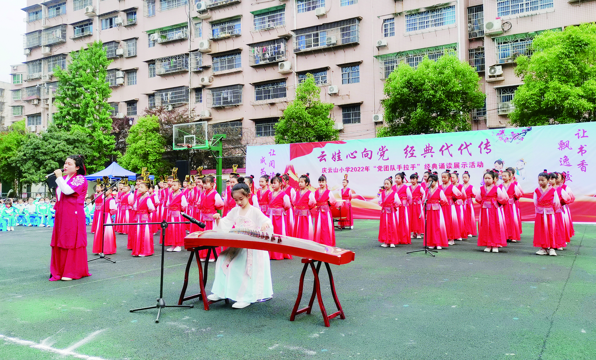 穿上古装服饰,朗诵着《将进酒》的孩子们展示出李白的豪迈洒脱;换上黄梅戏服,他们又摇身一变成了精灵古怪的少年,生动地表现出聪明才智;戴上鲜艳的红领巾,同学们许下句句誓言,立志报效祖国母亲……还有可爱的老师们,与同学们共同演出。