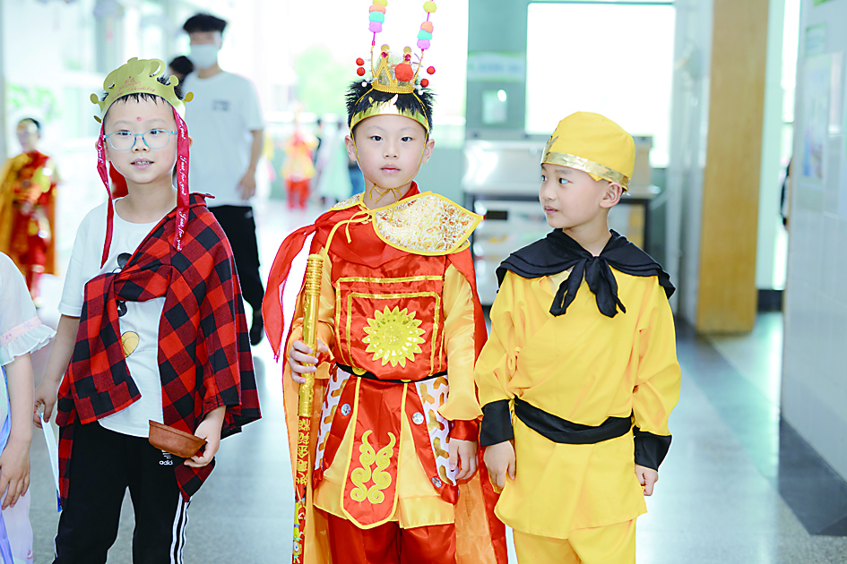 本来书声琅琅的教室,此刻变成了“花果山”、“莲花洞”;平日身着校服的男孩,换上他们最喜欢的孙悟空服装,而女孩们,则穿上各式美丽汉服,美美地走在春日的校园……