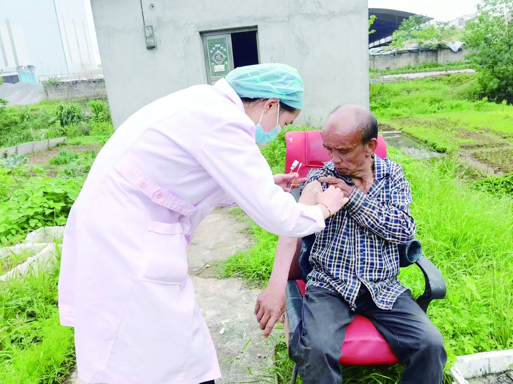 “在田间地头,几分钟就接种上新冠疫苗,还不耽误春耕生产,真是太方便了。”5月2日,在芦淞区龙泉街道早禾坪村,村民刘爹爹在田间劳作。龙泉街道社区卫生服务中心医务人员在老人间休时,为他接种了疫苗。