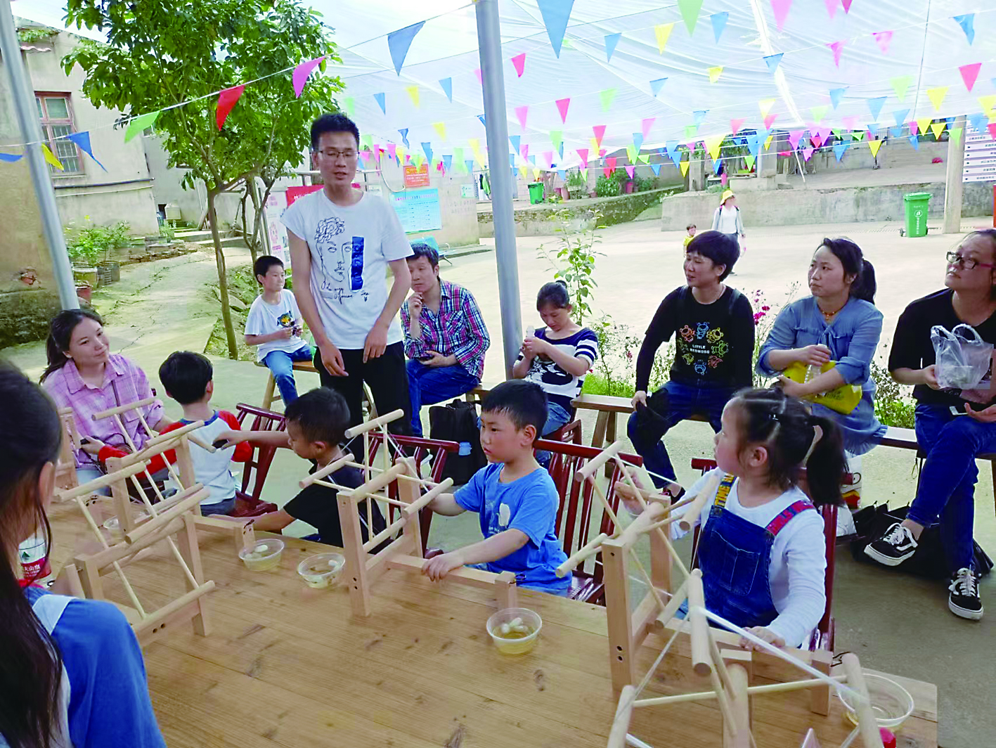 ▲杨思奇(站立者)在教小朋友使用抽丝机。受访者供图