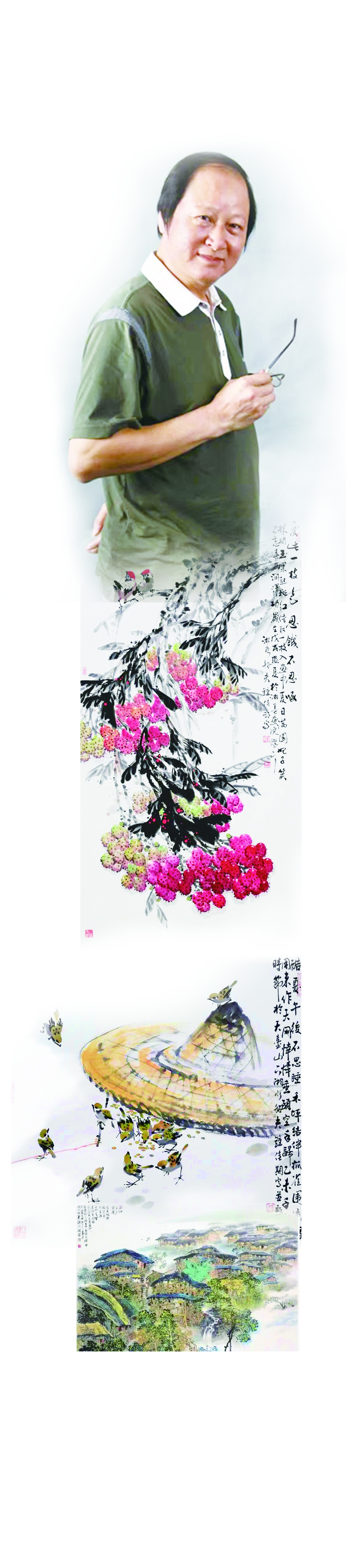 在花鸟画上,可以看出他对吴昌硕、齐白石、郭味蕖、陈半丁等大家的广收博纳,画干画枝画藤画石,用笔老辣、凌厉,而花、果、虫、鸟的勾画、设色,清新自然,赏心悦目。他的这类画,物象繁复,饱满、丰盈,大处、小处都精心运筹,同时,繁中见简,疏密有致,条理分明,顾盼生姿,令人可观、可触、可思,殊为不易。