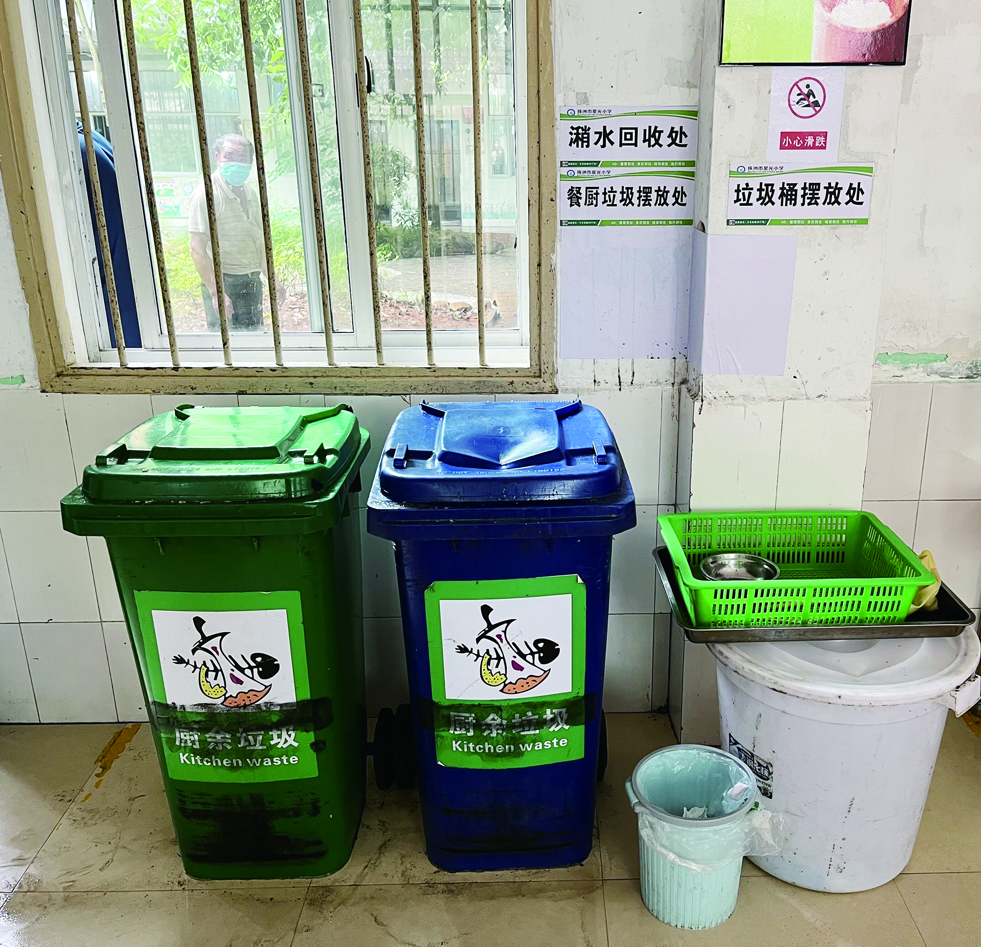 ▲星光小学食堂内的潲水回收处,两个大垃圾桶散发出很重的异味。记者/刘平 摄