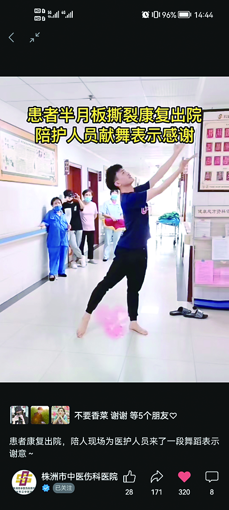 暖心 陪护亲友来医院跳舞致谢 近日,欧女士半月板撕裂,经株洲市中医伤科医院治愈出院。其陪护亲友除送上锦旗之外,还即兴表演了舞蹈《听我说谢谢你》,向医护人员表达谢意。 据该院运动医学科主任唐华介绍,欧女士是一名舞蹈教师,因车祸导致半月板撕裂,入住伤科医院后,医生首先用支具固定伤处,再采用中药外敷、熏洗,并结合功能锻炼进行治疗。目前,欧女士伤处恢复良好,可以继续从事舞蹈教学工作。 (图文由“株洲市中医伤科医院”提供)