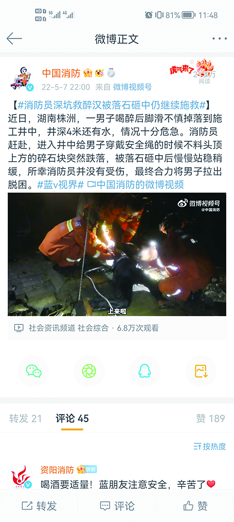 点赞 近日,株洲一男子酒醉后不慎跌入施工井中,井深4米还有积水,情况十分危急。消防员赶赴现场救援,进入井中给男子系安全绳时,不料头顶碎石突然跌落,消防员被落石砸中,所幸戴了安全帽没有受伤。消防员最终合力将男子救出。 对此,网友们纷纷点赞:“注意安全,辛苦‘蓝朋友’啦!”“希望每次都能平安归来!” (图文由微博“中国消防”提供)