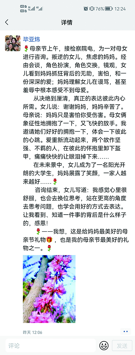 5月8日母亲节上午,株洲市中医伤科医院心理咨询师毕亚炜接到株洲市检察院未成年人保护中心负责人电话,邀请她为一位涉罪少女及其母亲做心理咨询。经由会谈、角色交换、镜观等方式,毕亚炜让这位女儿看到了妈妈抓狂背后的无助、害怕以及深深的爱;也让妈妈理解了女儿在谩骂和羞辱中根本感受不到母爱。