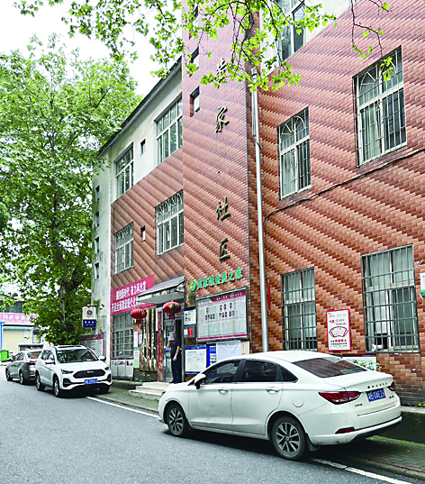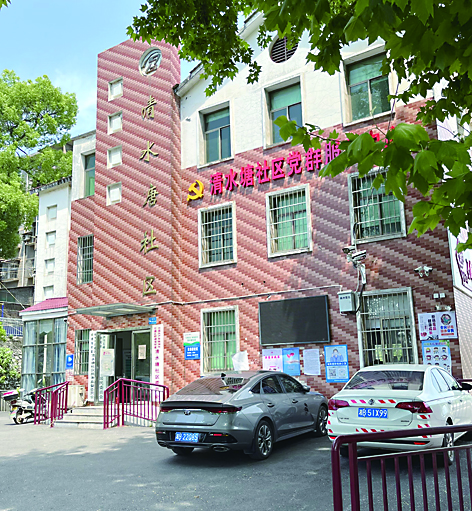 清水塘社区居委会,安装在外墙上的“清”“塘”两字已有部分脱落,字体不完整。