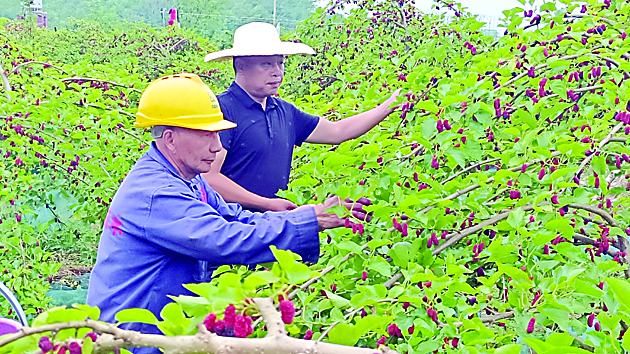 自己富了,他还想带着家乡人一起富。除了租用当地村集体土地为当地创收,他还雇用了周边400多名劳动力进行集中采收。同时,通过“公司+村集体合作社+农户”的模式,他在王仙、大东富两个村试点100余亩药桑种植田,公司为农民提供药桑树苗和种植技术,待挂果后统一进行收购。