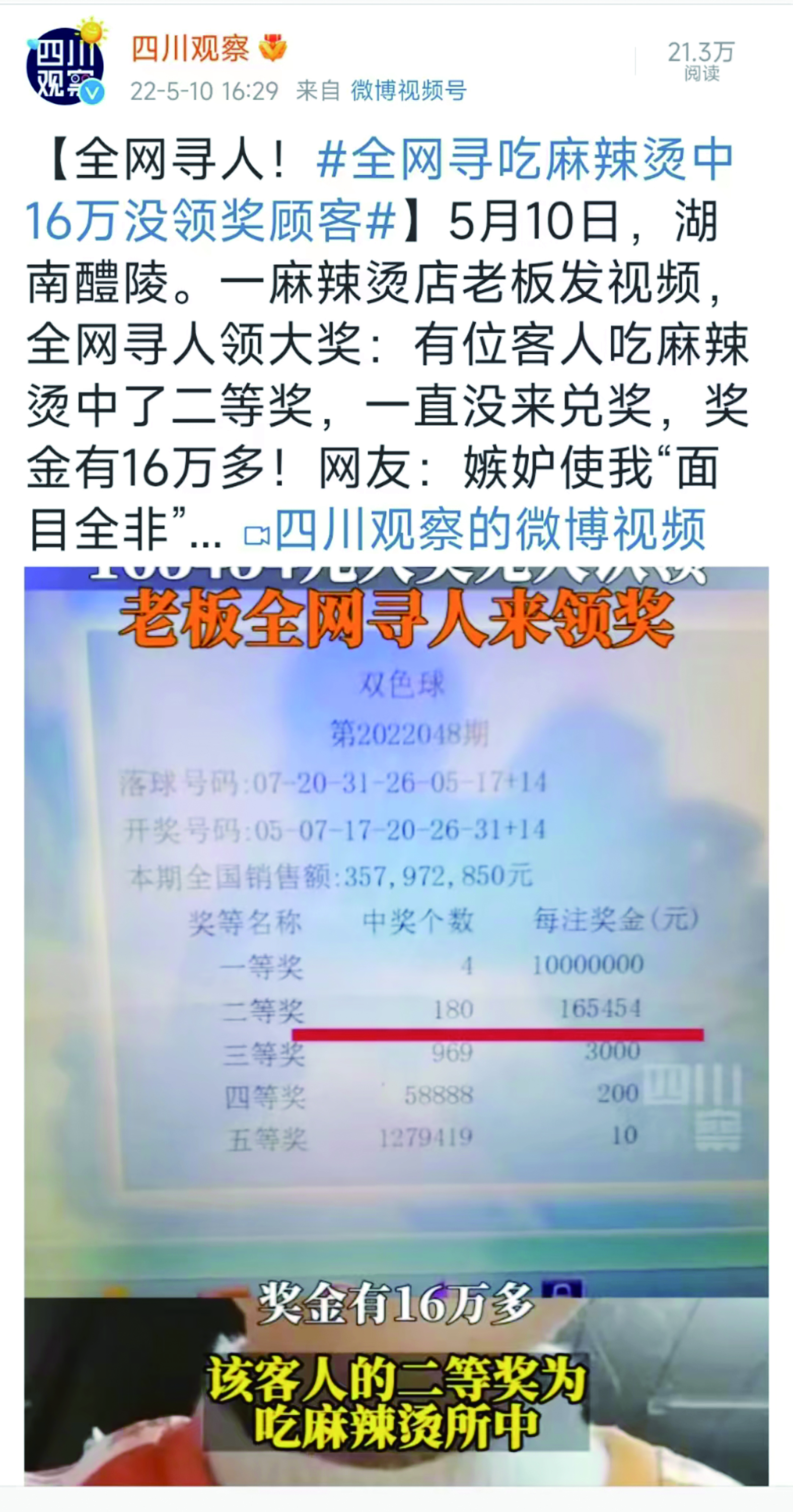 5月10日,湖南醴陵。一麻辣烫店老板发视频,全网寻人领大奖:有位客人吃麻辣烫中了二等奖,一直没来兑奖,奖金有16.5万元!