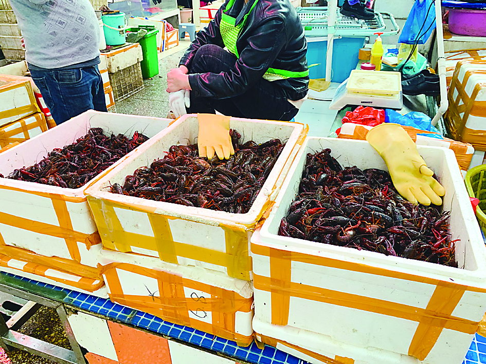 ▲市场里待售的小龙虾摆在最显眼的位置。 刘芳 摄