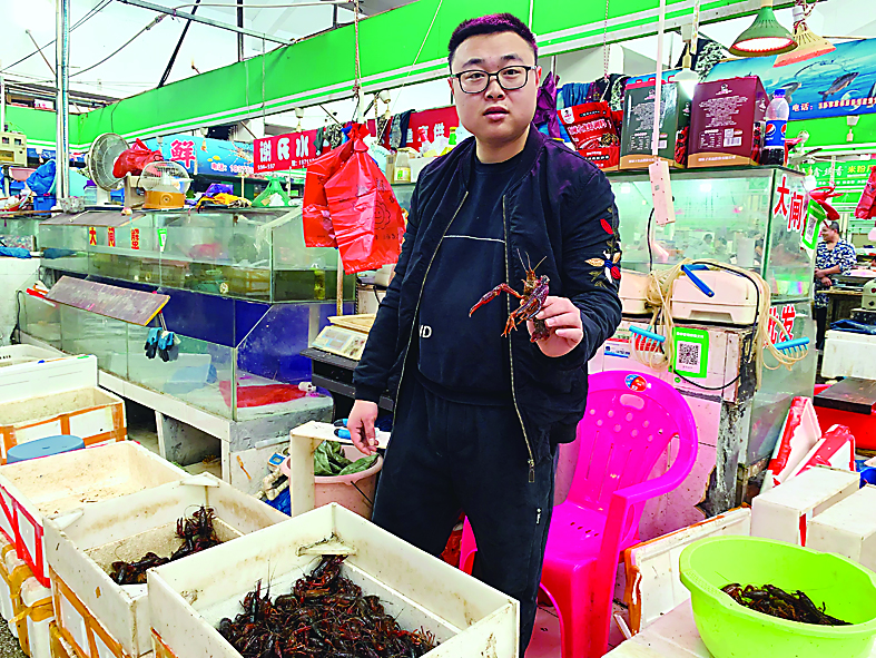5月10日一大早,记者在天纺农贸市场看到,商家早早地把一盆盆小龙虾摆在显眼位置,规格不一的小龙虾在盆中挥舞着双钳,等待着消费者挑选。
