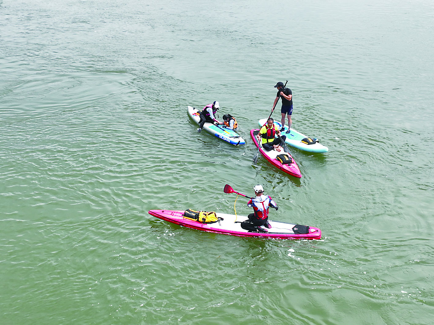 在湘江水中央,只见一群身着救生衣手握船桨的人或坐立,或直立站在平坦的板上,用桨划行,迎着江风,又酷又飒,好不惬意……