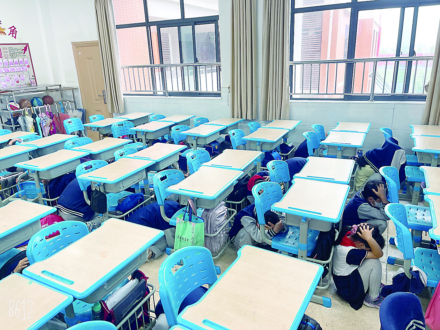 ▲紧急信号发出,同学们迅速躲避。记者/戴凛 摄