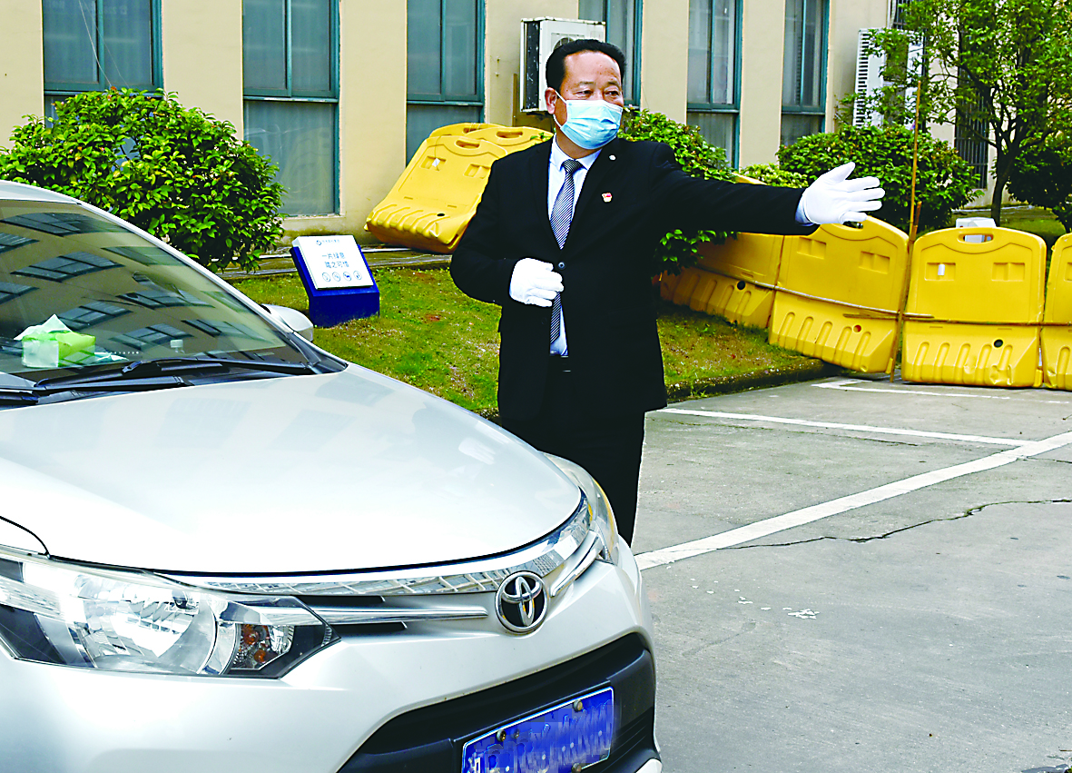 ▲吴度开引导车辆停进车位。记者/沈全华 摄