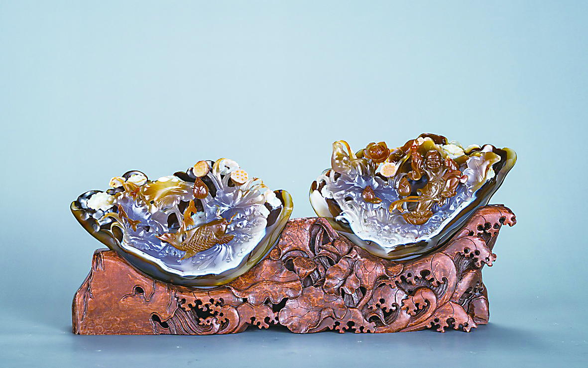 杨克全大师的设计风格独特,他将绘画技艺和玉石雕刻艺术相结合,将西方的立体圆雕风格和中国古典平面浮雕结合在一起。作品《吉庆有余》选用上等天然玛瑙,将其一分为二,以天然原石的自然纹理和色彩作“颜料”,精雕细刻出一个胖娃娃手里拿着荷叶踩在莲花上跳舞,莲蓬上鱼儿自由的嬉戏,寓意连年有余,吉庆有余。作品用料考究,构思奇妙独特,雕工精湛。以传统吉祥纹样为素材,巧妙的用俏皮手法将主体物烘托,有增强寓意的艺术效果。(本报综合)