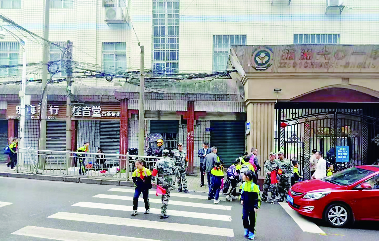 ◀老兵们为601中英文小学的孩子们护学。 受访者供图