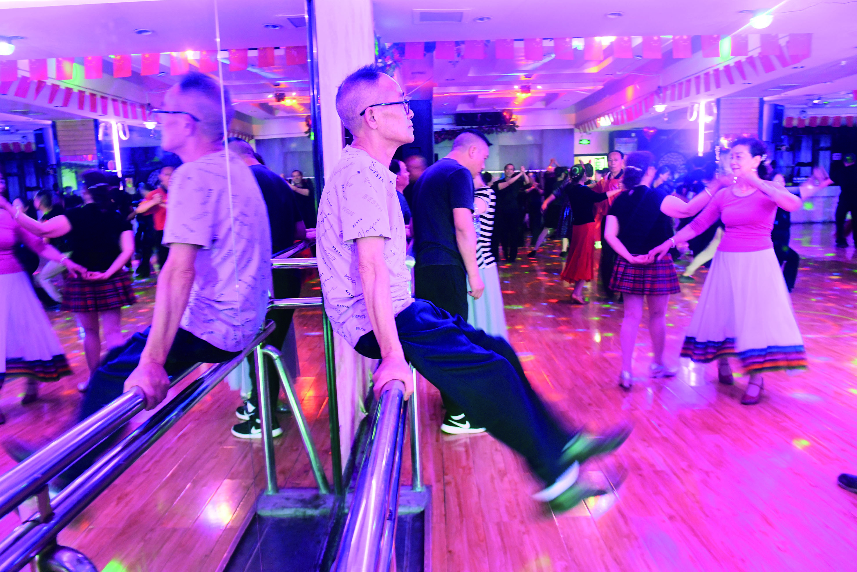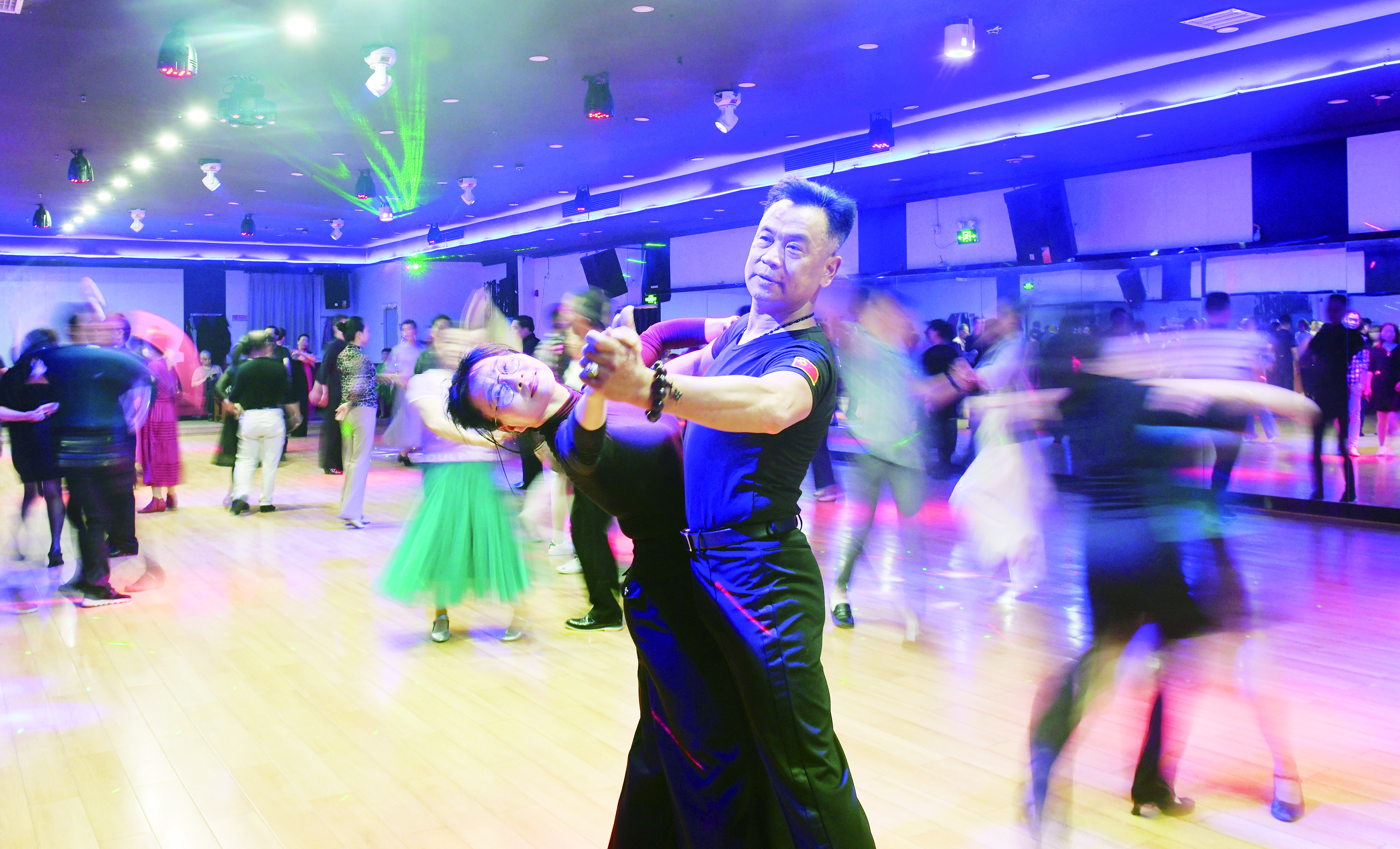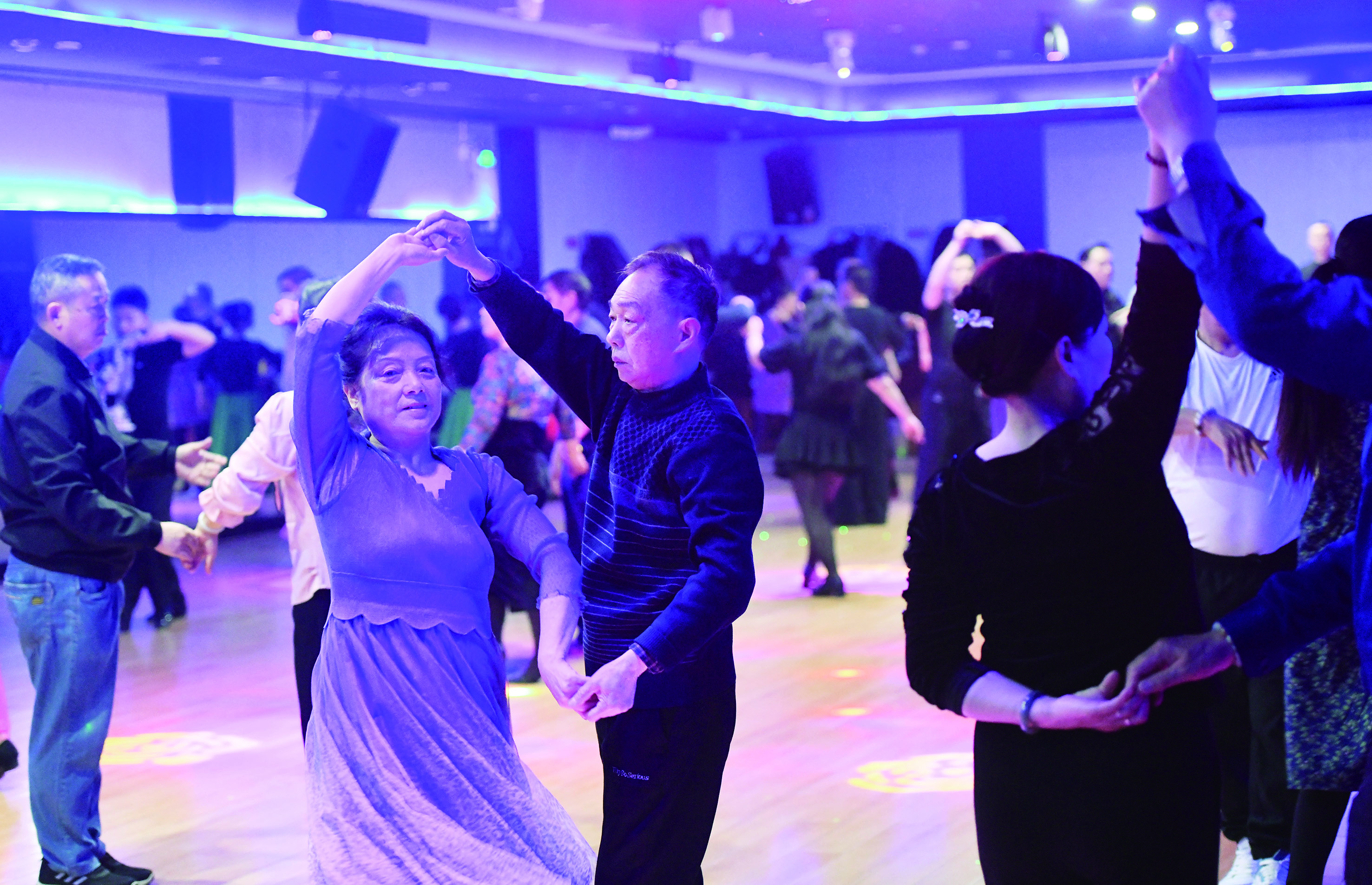 走进城区的这些老舞厅,仿佛时光倒流。色彩斑斓的彩灯映射在舞池的地板上,伴随着具有年代感的舞曲,人们或扶或揽着舞伴,左摇、右摆、转圈、挪移,跳着或轻缓或张扬的摩登舞步。男士们穿着没有那么刻意讲究,女士们则稍稍梳妆打扮,长裙轻轻摇曳,美丽与气韵同在。