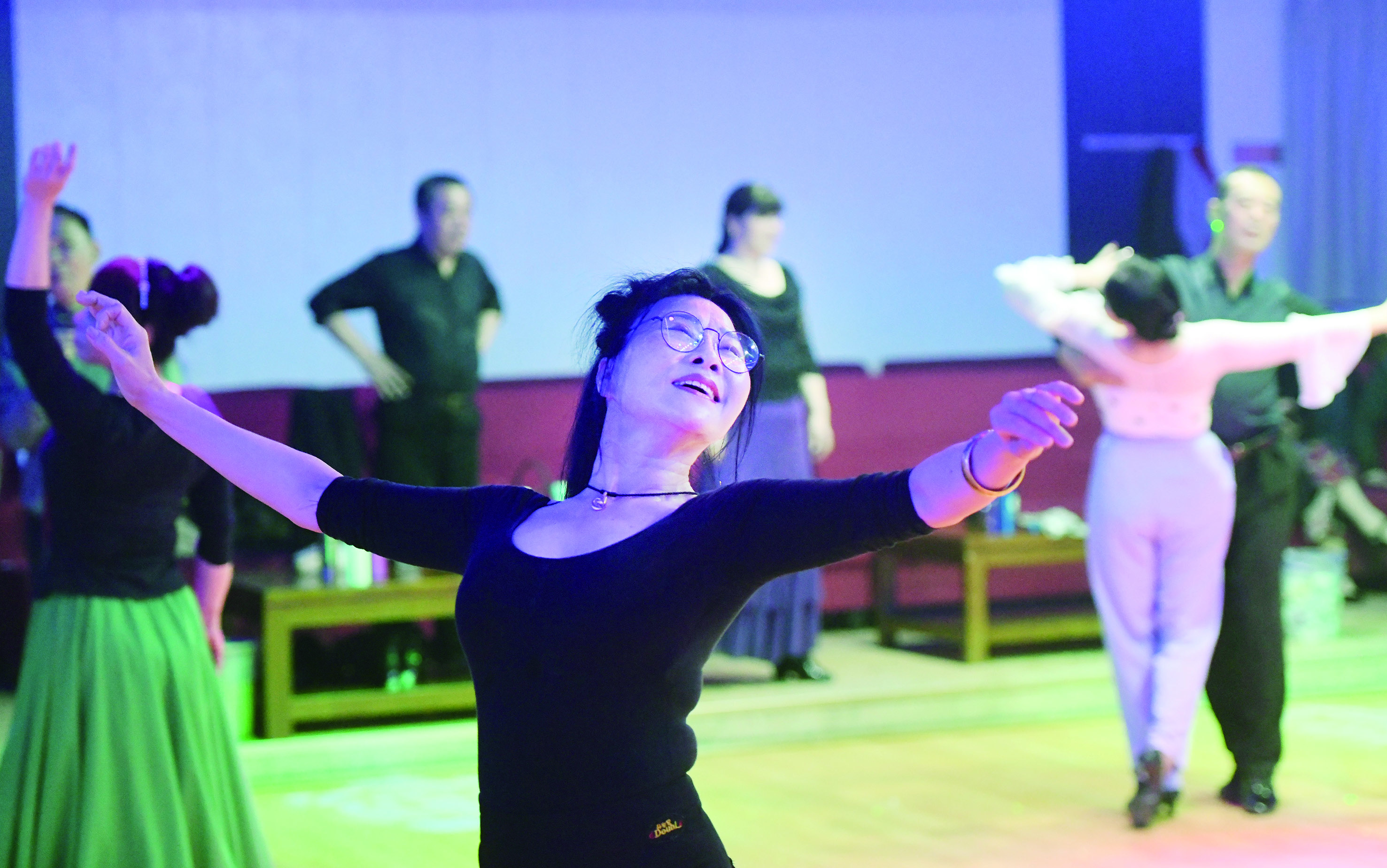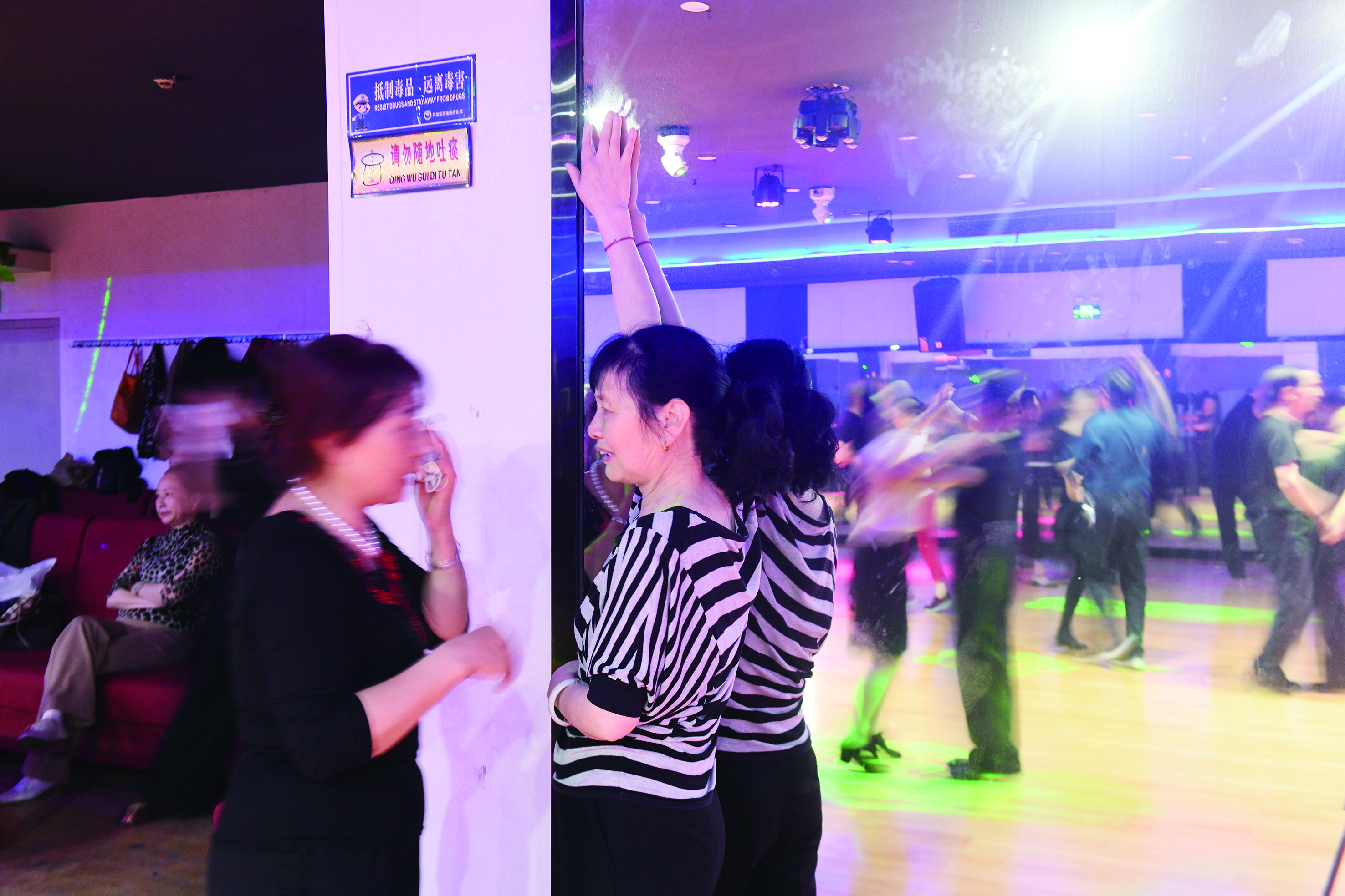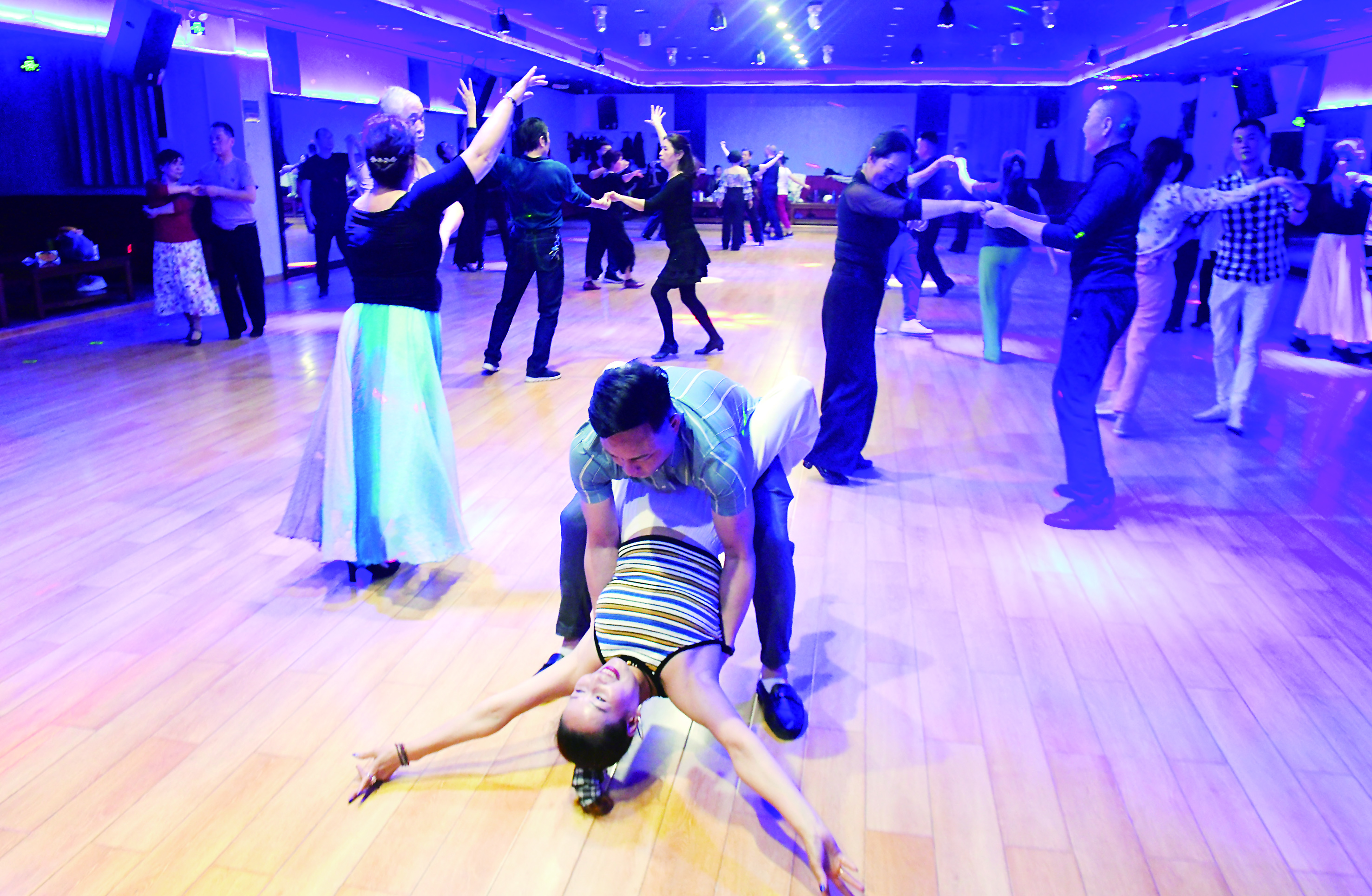 走进城区的这些老舞厅,仿佛时光倒流。色彩斑斓的彩灯映射在舞池的地板上,伴随着具有年代感的舞曲,人们或扶或揽着舞伴,左摇、右摆、转圈、挪移,跳着或轻缓或张扬的摩登舞步。男士们穿着没有那么刻意讲究,女士们则稍稍梳妆打扮,长裙轻轻摇曳,美丽与气韵同在。