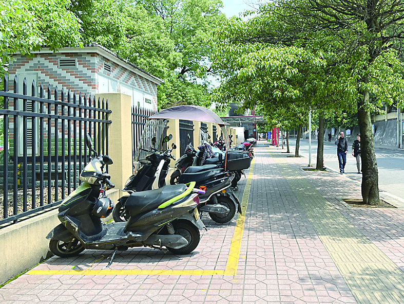 星光小学前的人行道上多处增设非机动车位,规范非机动车停放。但人行道边墙上的乱涂乱画现象依然存在;水竹警务室招牌依然有污损;有“中国移动”字样的宽带箱仍然破损;校园周边小巷,空中缆线依然杂乱。