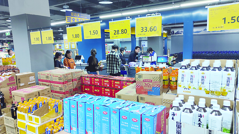 5月19日,记者走进该超市看到,装修呈简洁工业风,货架上摆得满满当当,墙壁上到处贴着“折扣价”“买到就是赚到”“超会买 超开心”的标语,前来购物的市民络绎不绝。
