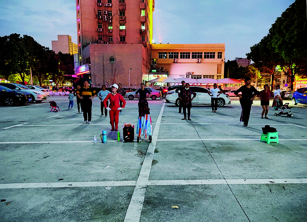 5月18日晚,天元区牛形山路无人收费停车场,一群跳广场舞的大妈为娱乐健身,拿着水壶、音箱、板凳占用停车场部分车位。除跳舞者外,现场不乏怀抱婴儿的宝妈、宝爸等围观人群,车辆出入停车场不便,也对广场舞人群形成安全隐患,同时该行为有碍市容市貌。