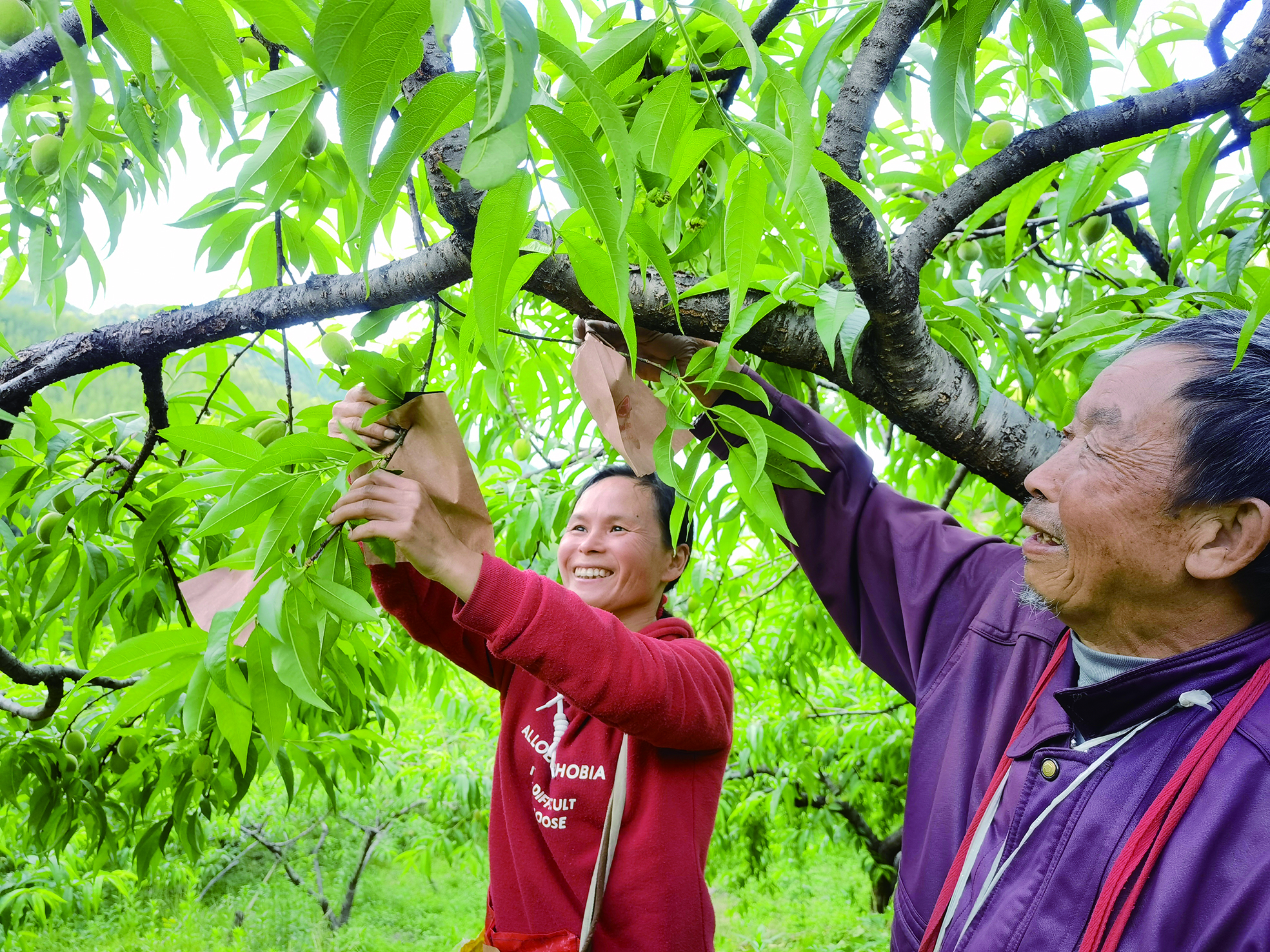 村民陈四妹在自家后山上种了4亩多黄桃,只见她麻利地从挎包里拿出纸袋,往果子上一套,然后扭紧,一颗颗如婴儿拳头大的小黄桃就安全入住“金纸屋”了。“一天能套2000多个袋。”陈四妹介绍,每年种黄桃能给她家带来10万元左右的收入。有些农户种的面积大,还得请人帮忙,每个劳动力每天可获得150元至200元的报酬。