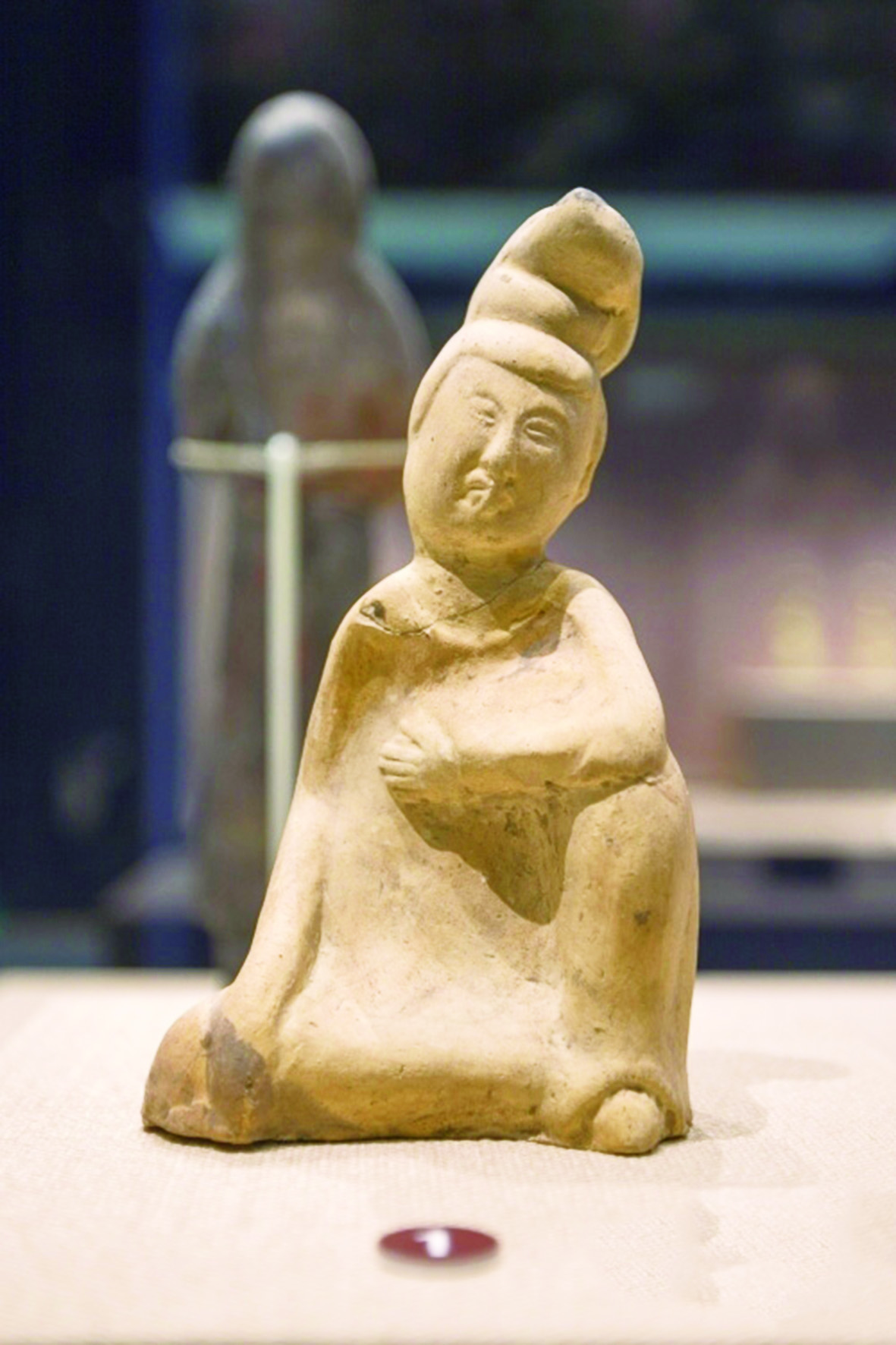 太原博物馆,一尊唐代的素烧女坐俑表情和动作似乎在展现 “心塞” 瞬间。
