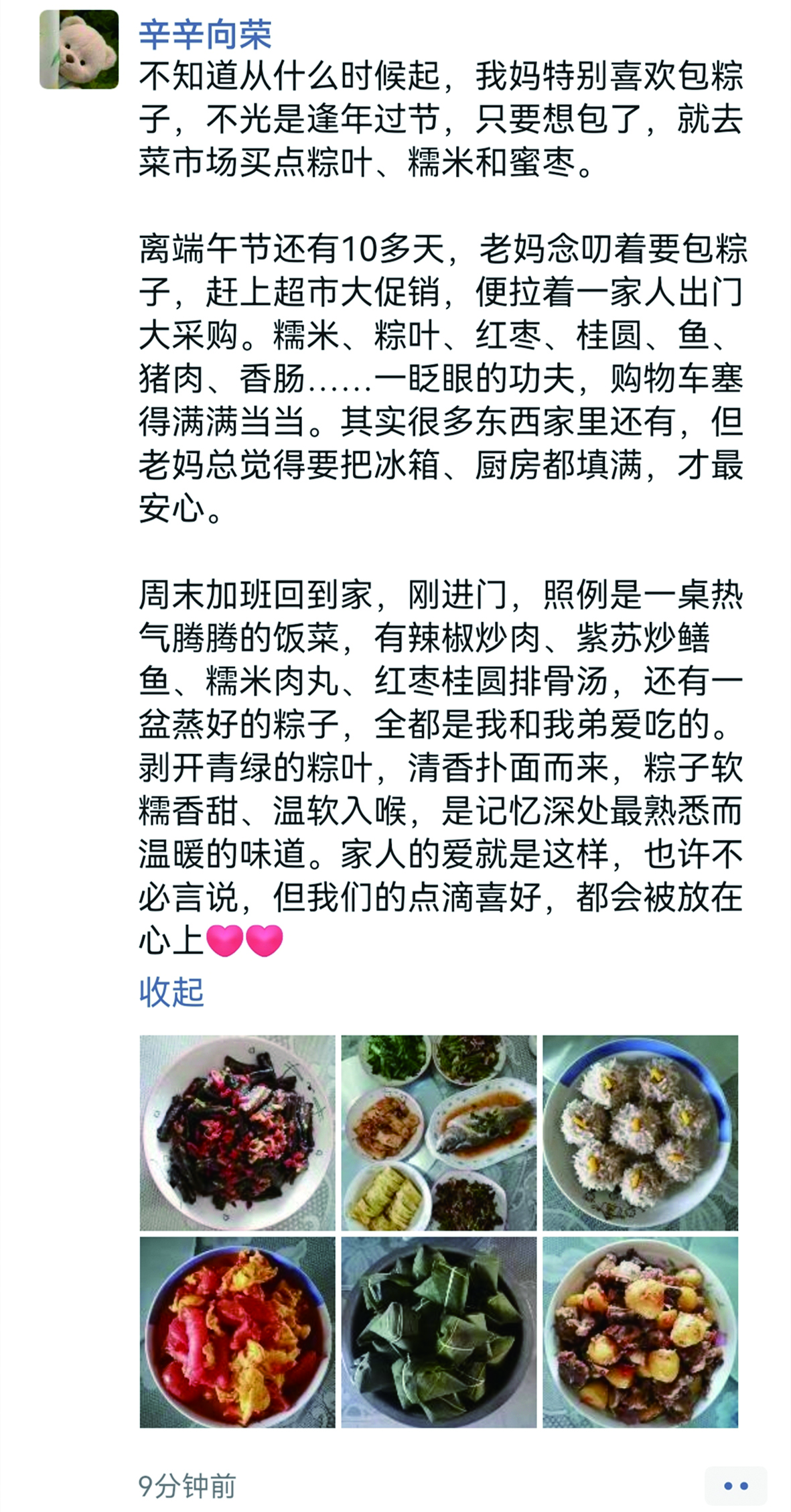 朋友圈里众多朋友羡慕不已,有人说:“是我喜欢的甜粽子,想去蹭饭!”也有人说:“这就是家的味道啊,我也想吃我妈包的饺子了。”