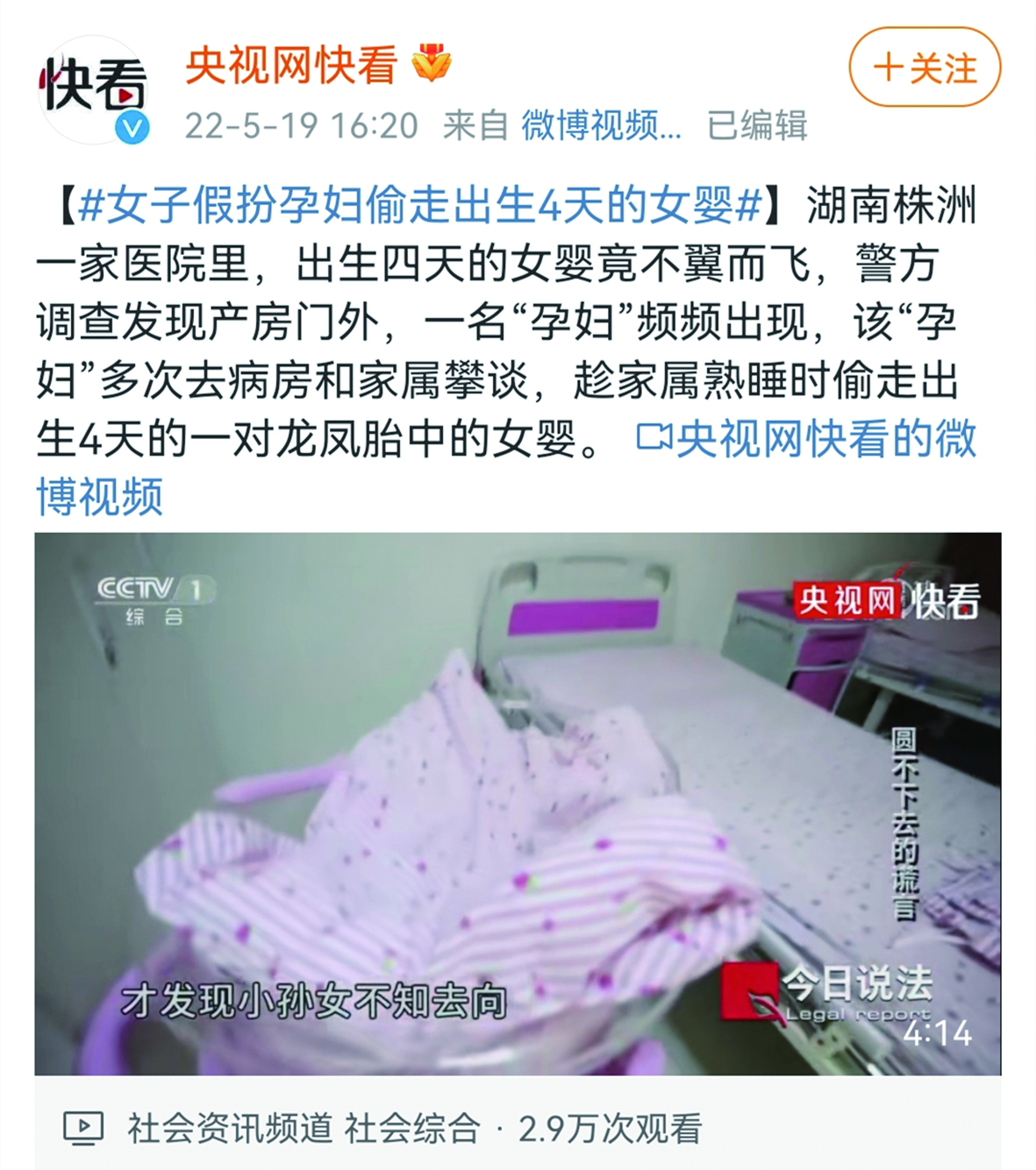 近日,株洲一家医院,出生4天的女婴不翼而飞。警方调查发现,在产房门外,一名“孕妇”频频出现,该“孕妇”多次来到病房和家属攀谈,趁家属熟睡时偷走出生4天的一对龙凤胎中的女婴。