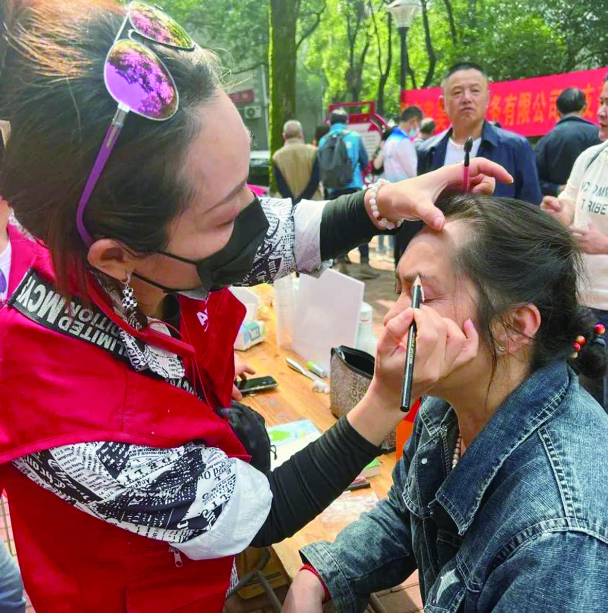 ▲安利志愿者为居民修眉。