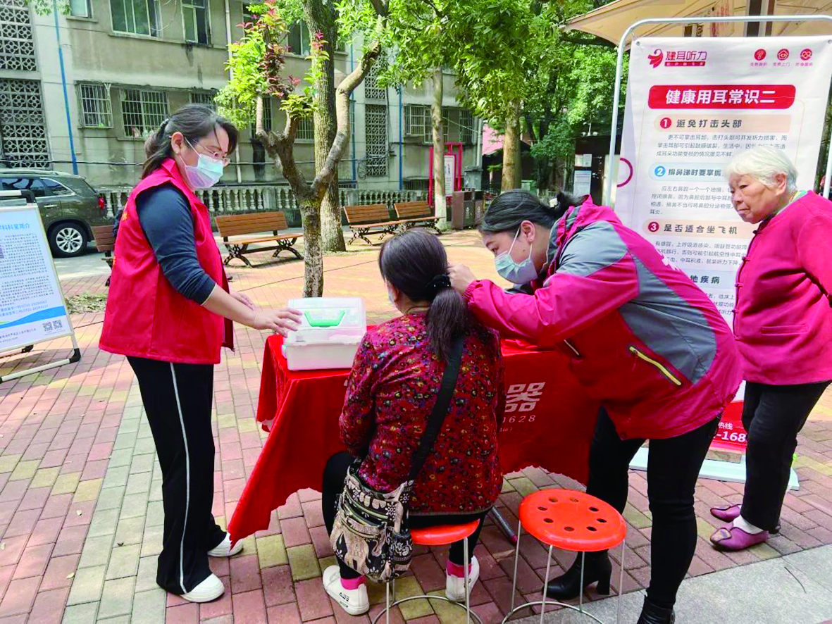 ▲健耳听力专业人员为居民掏耳朵。
