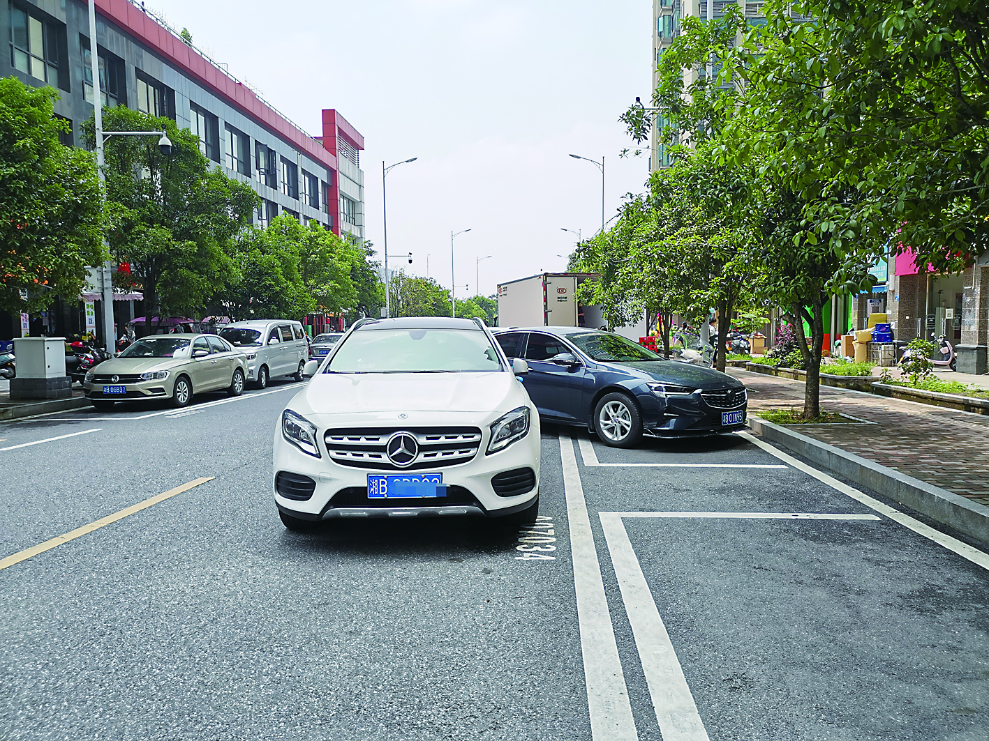 ▲天元区华府路上,一辆私家车违停在道路临时停车泊位外。 记者/姚时美 摄