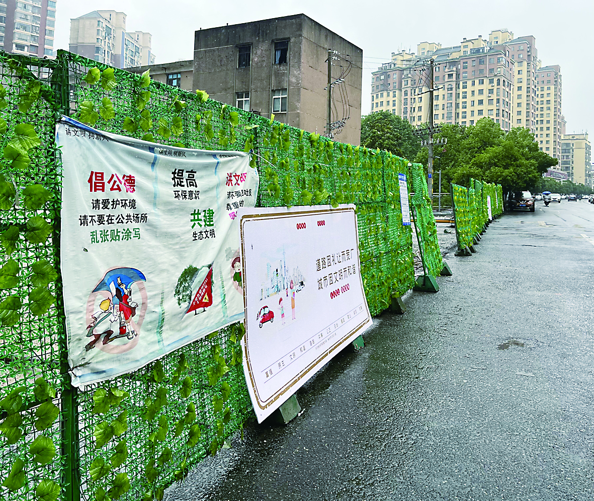▲部分建筑工地的围挡,公益广告张贴不规范。记者/刘平 摄