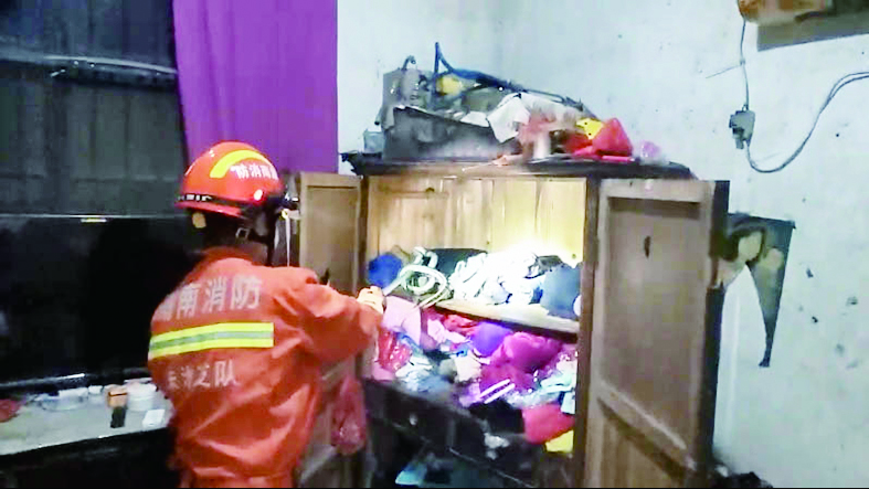 ▲消防员在衣柜中将菜花蛇捕获。通讯员供图