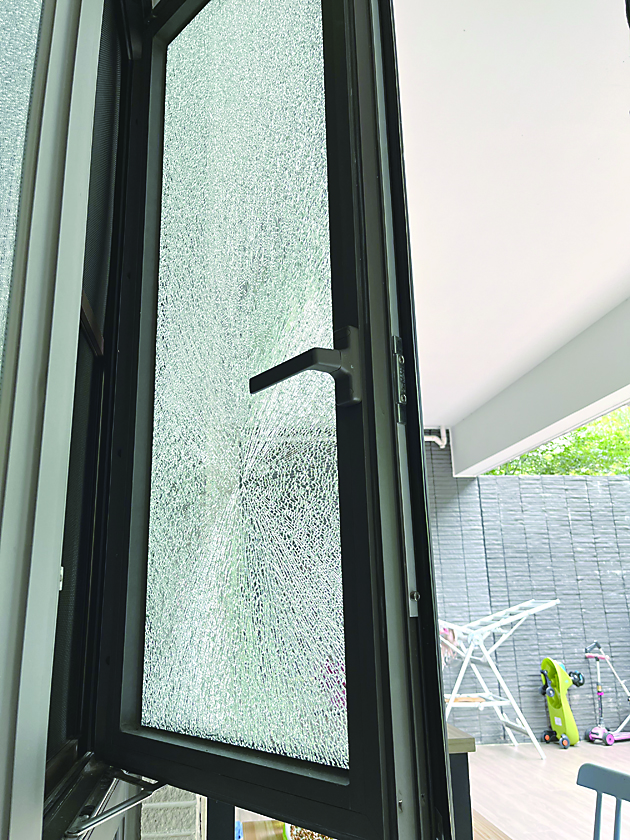 无独有偶。24日上午10时许,11栋102室业主李女士在客厅听到玻璃碎裂声,但她走出客厅查看未找出原因,以为是小区外面有玻璃碎裂。25日上午,李女士发现家中次卧有一扇玻璃窗已布满裂纹。