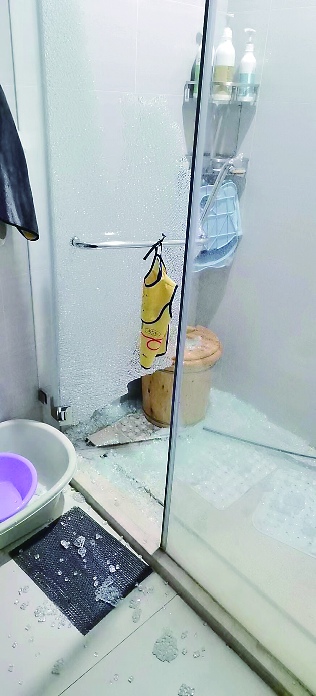 “嘣!当时把我们吓住了,以为有家人上厕所不小心摔跤,连邻居都听到了响声。”5月25日,13栋101室业主王女士回顾家中浴室玻璃门突然爆裂的情景时,仍心有余悸。