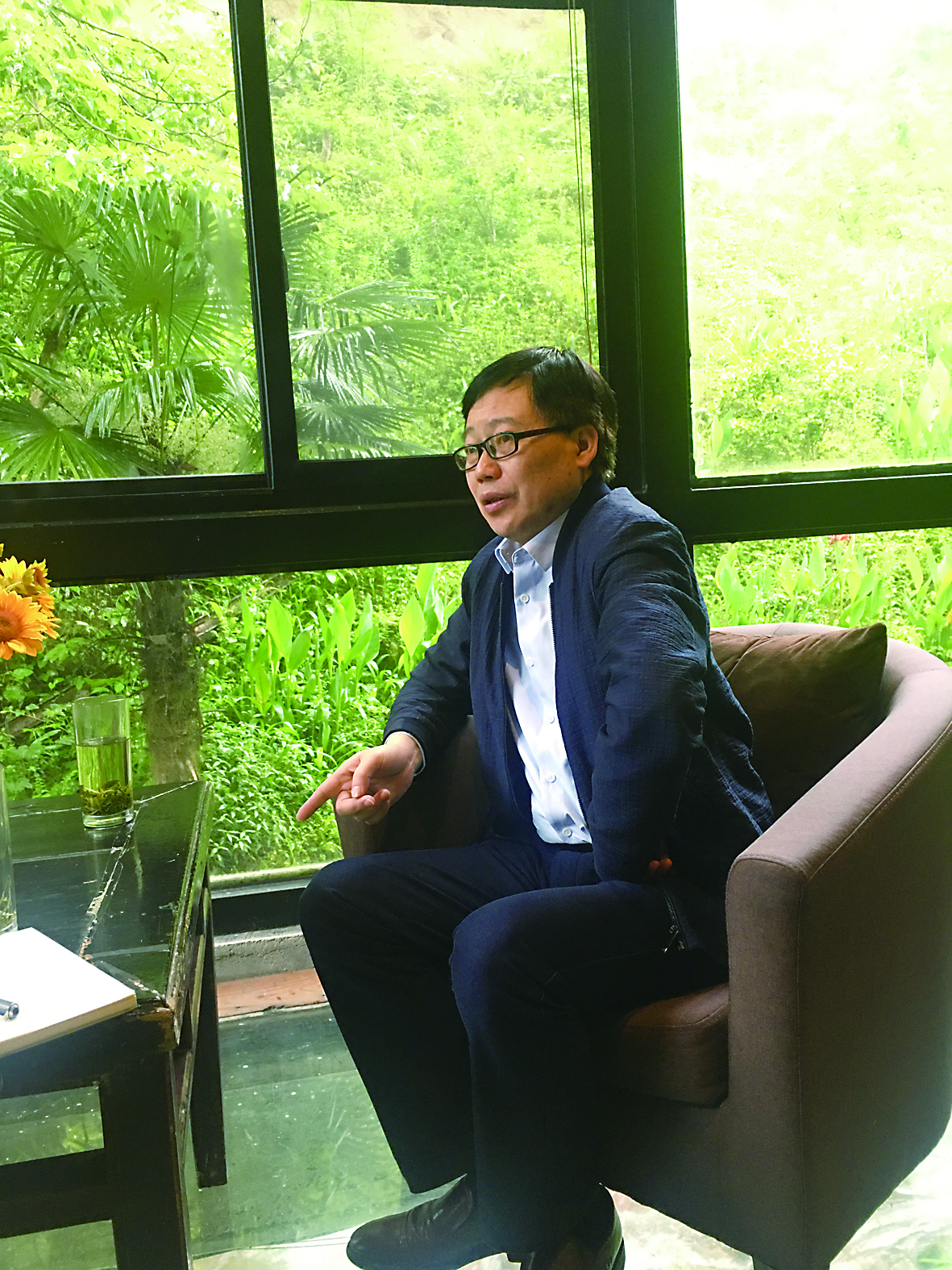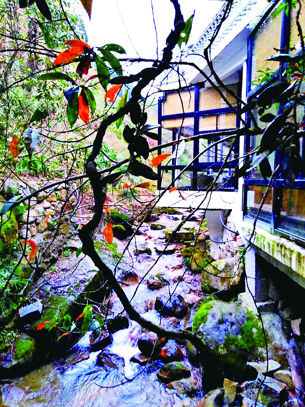 ▲坐在沙发上喝茶聊天,眼光透过落地窗,发现溪水和蔓藤构成美图。 受访者供图